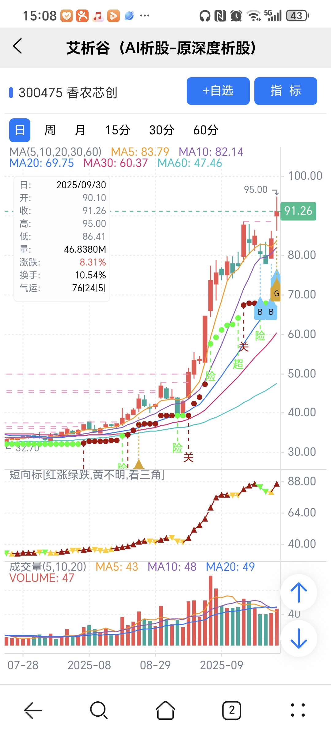 图中 B、G 关注标记是对应AI选股模型当天下午2点多给出。
