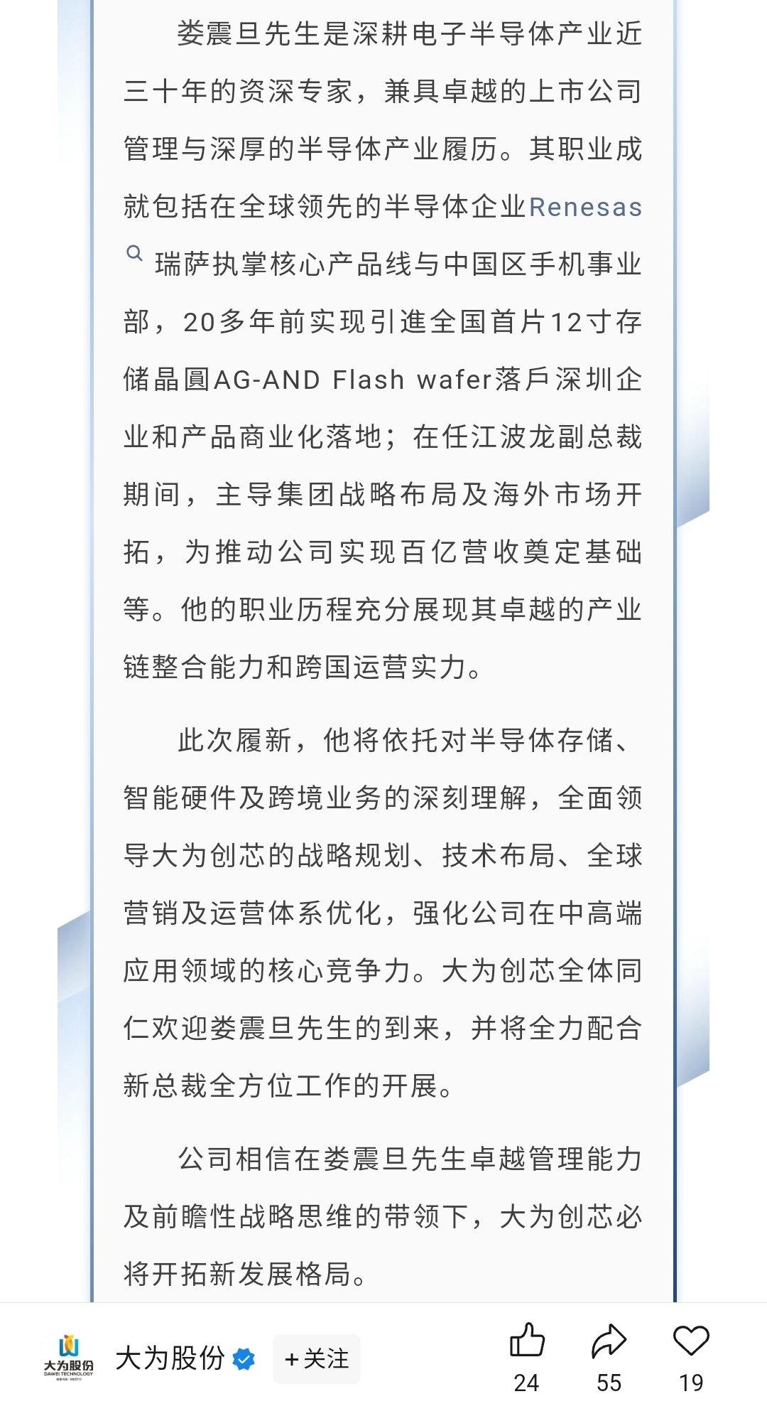 大为股份聘请江波龙原副总裁负责存储全产业链,目前,一系列存储已量产,接下来寄希望再造一个江波龙