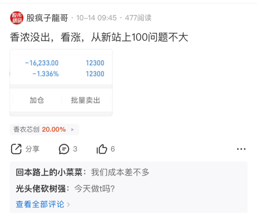 香浓我是上周五介入,中途我也提示,会继续突破100元,今天虽没卖高位,也许明天会大涨,我不后悔