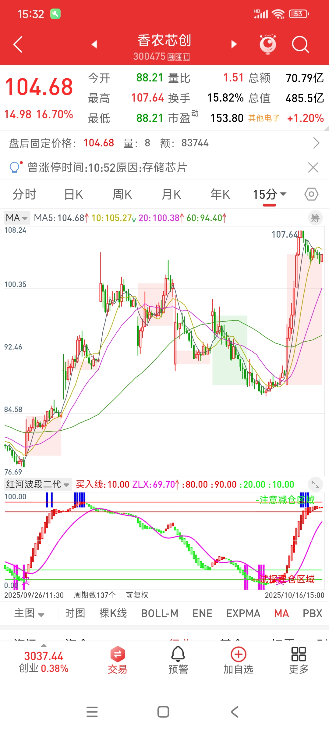 $香农芯创(SZ300475)$ 15分钟级别底部跳买以后,然后绿柱转红柱做确认,本来因为这里只是反弹,没想到直接爆拉,少见的小级别带动大级别,这里只能说要开始注意风险,只要明天不继续加速,红柱必然会转绿柱,到时候直接止盈。