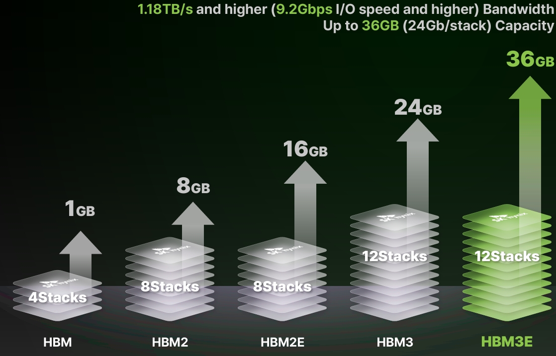 生成式 AI 对高容量、高带宽、低功耗的存储需求持续增长,而 HBM3E 的容量(36GB)、带宽(1.23TB/s)、能效(10% 提升)升级,恰好精准匹配这一需求,为其市场增长提供核心驱动力。