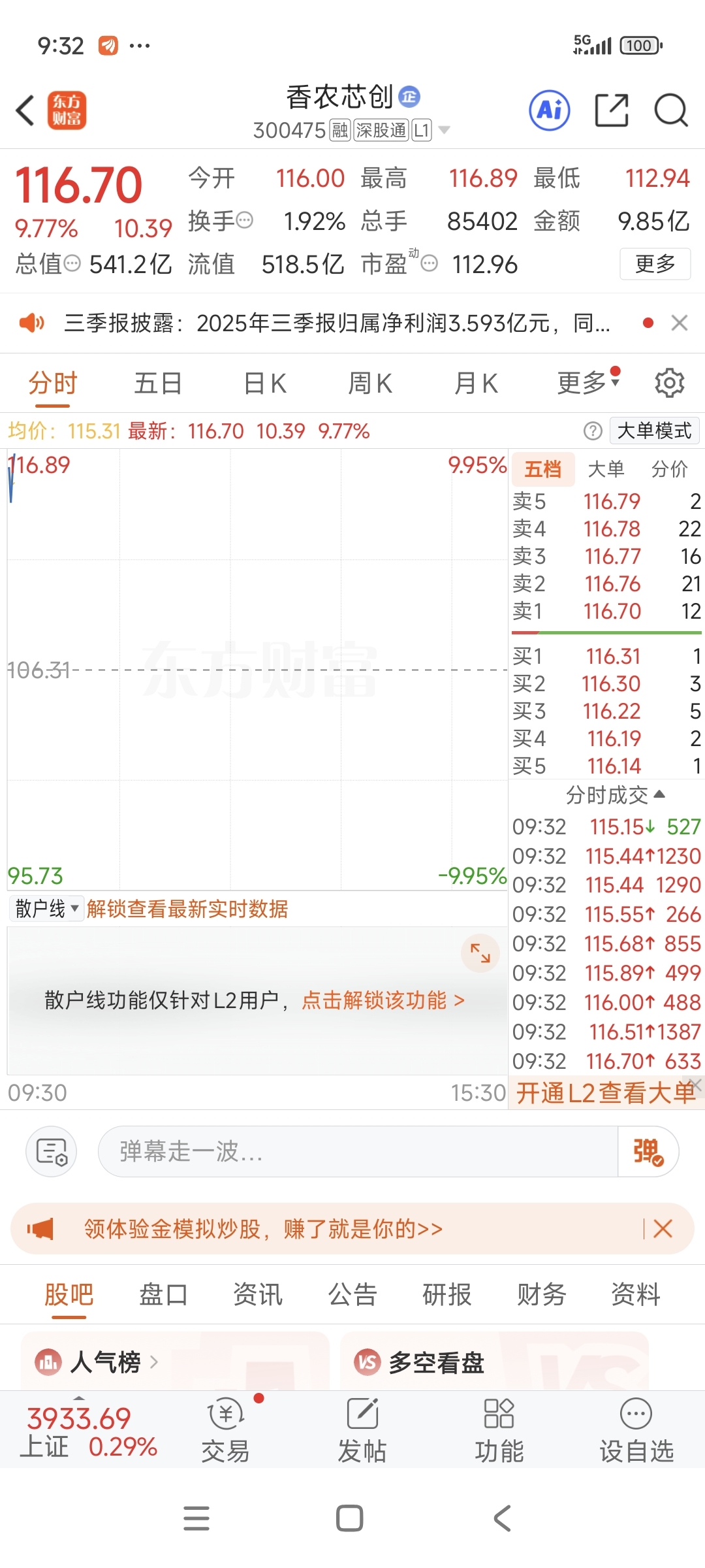 $香农芯创(SZ300475)$ 116.7全部出了!