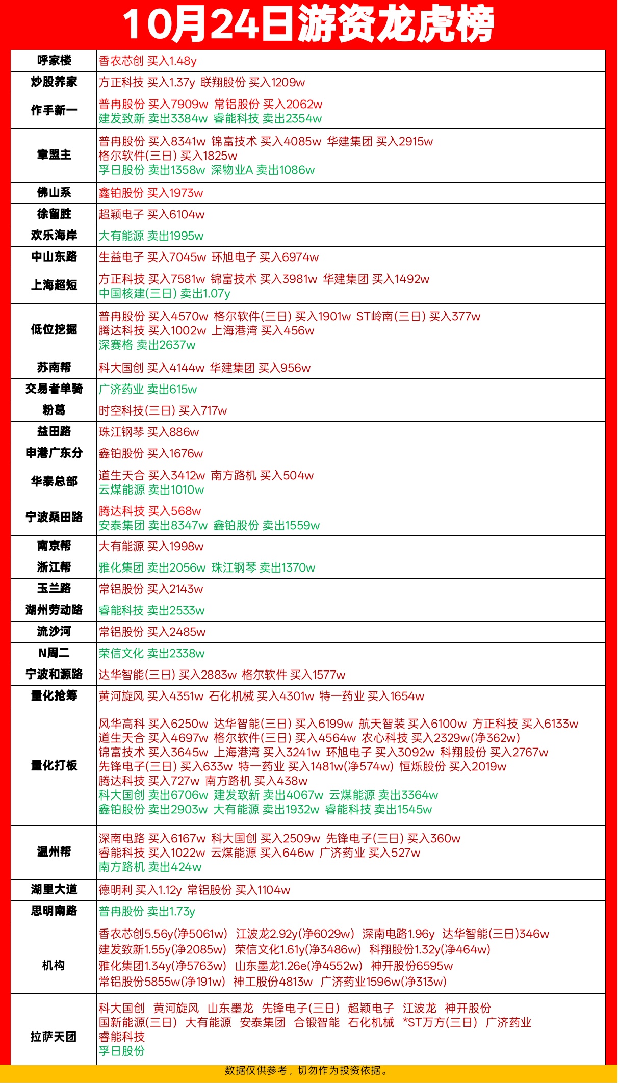 10.24游资龙虎榜,呼家楼欢乐海岸章盟主上榜。