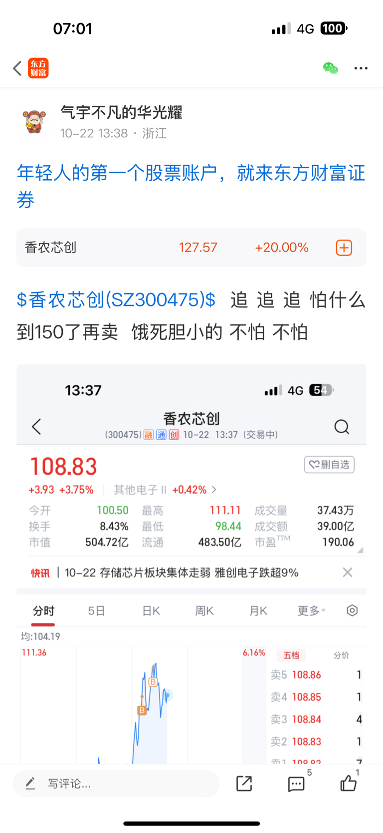 $香农芯创(SZ300475)$ 111.11跑的那些人后面有没有进来 我说过这个票短期能到150 号是跑了 的高点也要看行情的。