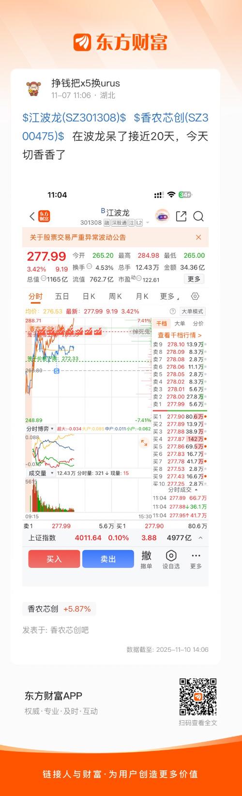 $江波龙(SZ301308)$  $香农芯创(SZ300475)$  在波龙呆了接近20天,今天切香香了