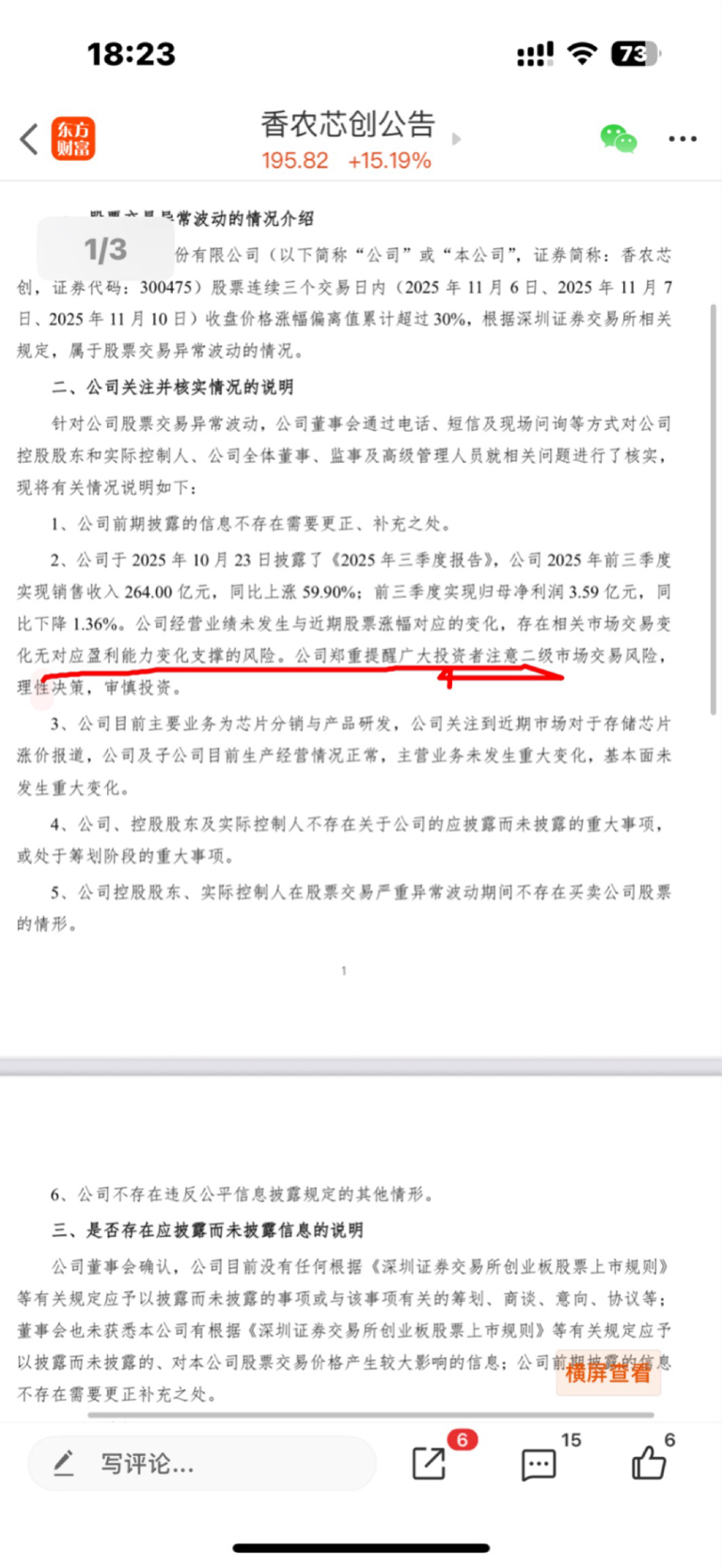 $香农芯创(SZ300475)$ 不是唱空,今天的公告,用词变化,公司认为无对应股价的业绩,也关注到储存芯片涨价的情况,郑重提醒,还有超过百分之五股东减持,之前报告没有变化,公司也知道涨价!理解为,外面芯片涨价是他们的事,现在市场对它的炒作是非理性的,我没有业绩对应股价的预期增长,没有预期,马上有增长也达不到现在股价的市盈率,都是二级市场的非理性炒作,也知道涨价,靠业绩兑现的指望是不可能的,对应不了现在的股价,这样的表述好像第一次这样用词,猜测、公司也觉得涨太高,因为减持而炒作嫌疑,所以公开说、表明,不用考虑涨价对业绩的影响,不会对应现在的股价与市盈率,公司这样表达,也就是要灭火,涨价无非是业绩上升,现在明确告诉大家,生产正常,不会有明显的对应业绩给到大家,大家自己多自求多福!看来最后一棒了!明天危险了!