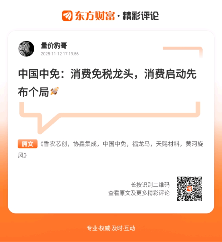 中国中免,昨天就留意上中国中免了,毕竟是免税一哥,但底部板块最怕的就是一日游,跟渣男似的骗你上车就跑,所以特意多观察了一天,确认不是短期炒作才动手。消费回暖最直接的受益股就是它!海口海关刚晒的成绩单,11 月前 7 天离岛免税卖了 5.06 亿,同比涨了 34.86%,这消费力真不是盖的~ 它在海南有 6 家离岛免税店,海口、三亚那两家都是全球排得上号的大综合体,渠道优势没人能比。而且还搞了电商平台,整合旅游资源,烟酒、香化这些免税商品卖得风生水起。今天盘中它表现比东百弱不少,还一度走低,我趁着回调果断上车了。虽然没吃到涨停,但作为行业龙头,政C支持 + 业绩回暖,长期来看还是靠谱的,打工人炒股,求稳最重要。