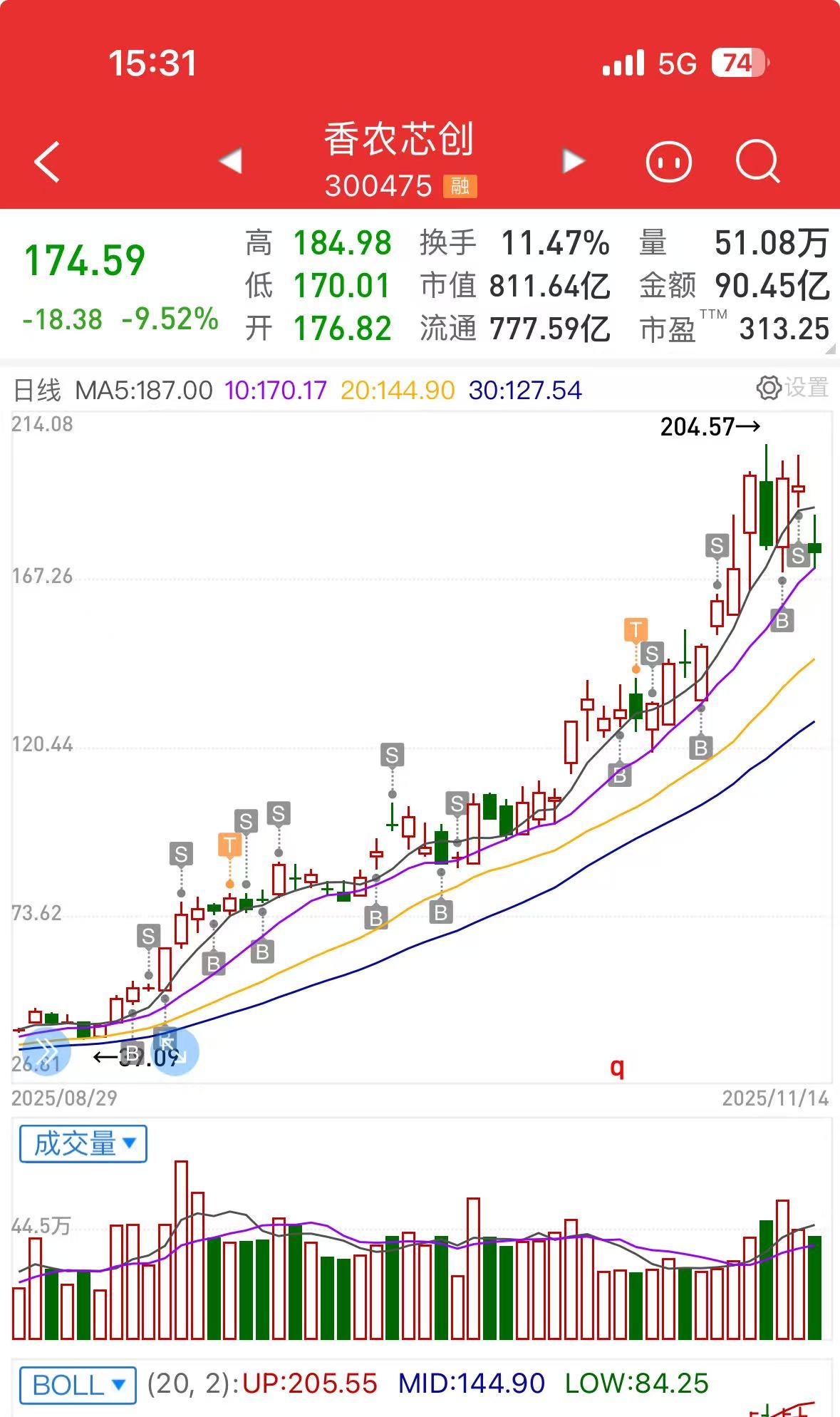 $香农芯创(SZ300475)$ 在这里做了4个波段,65到80,120到158,171到195,长长跌跌是常态,我不相信趋势会结束,周一二有机会再进,不贪就好,现在高位票都是急涨急跌,自己小心点就好
