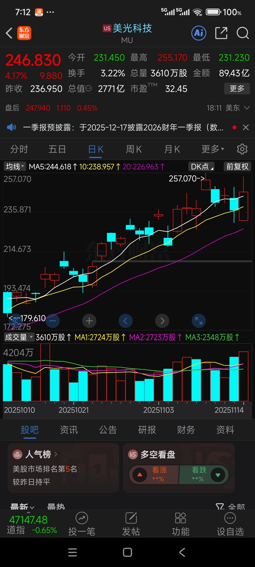 美光科技巨量阳包阴,周一晚上还会延续上涨趋势!