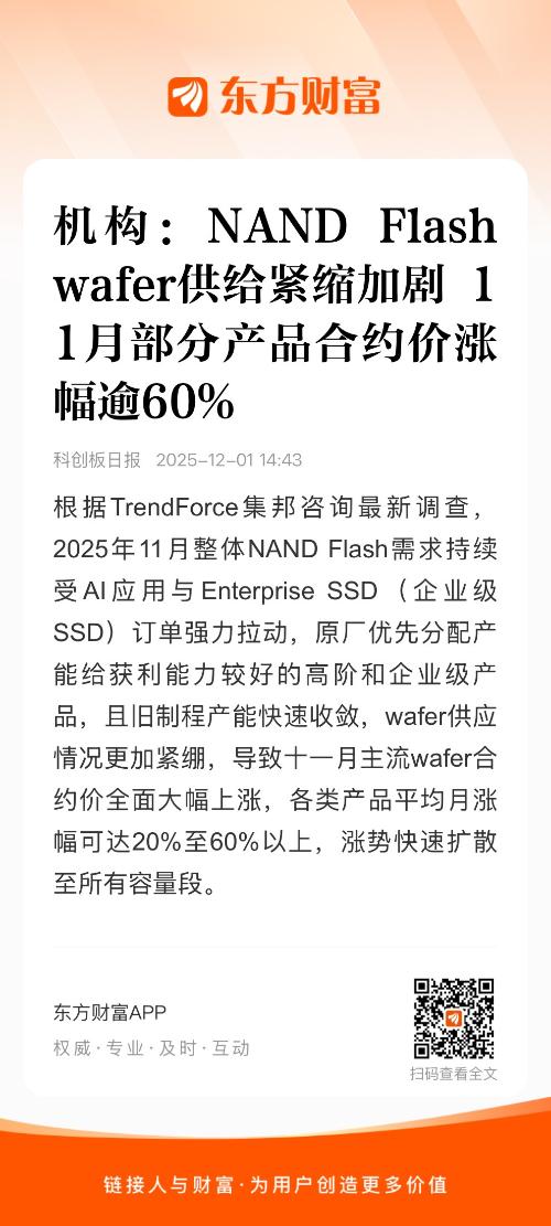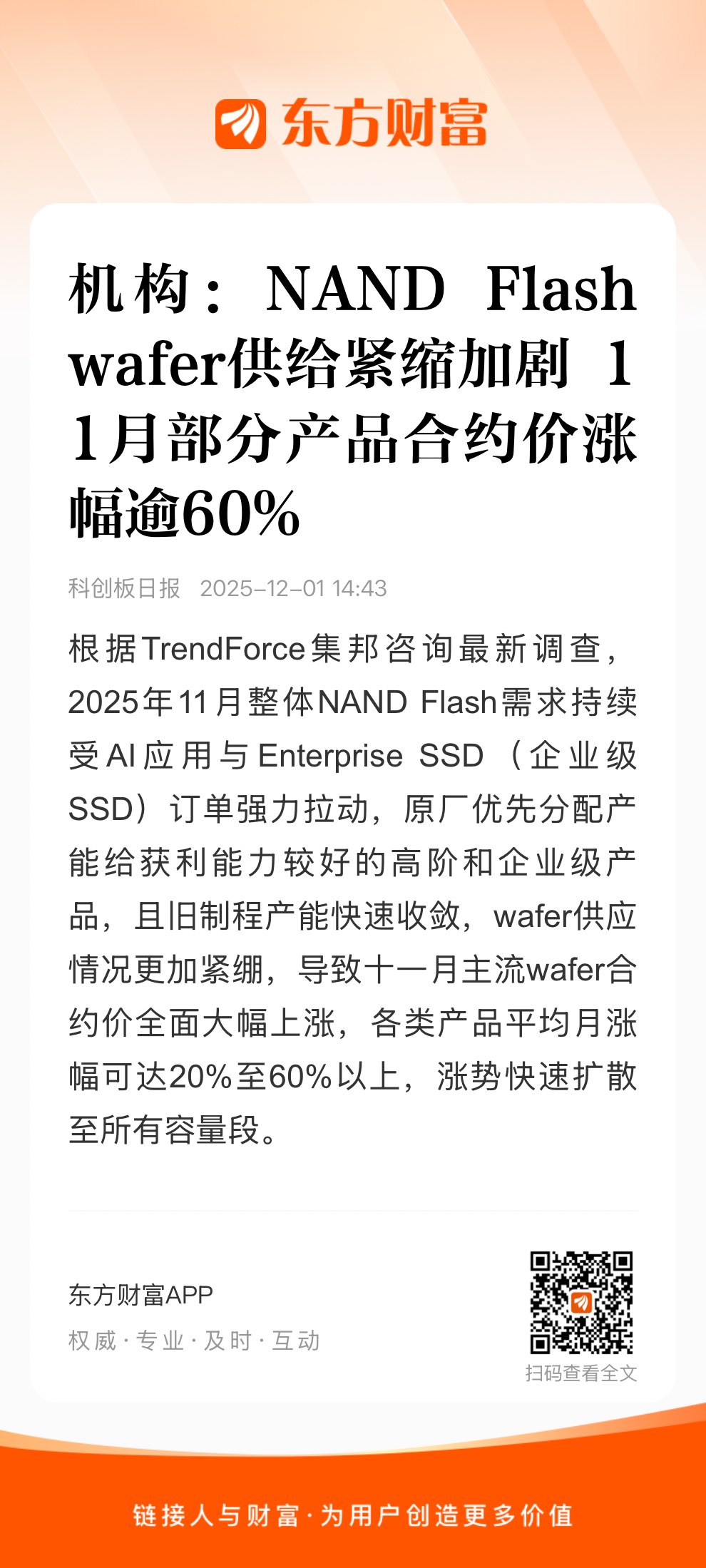 根据TrendForce集邦咨询最新调查,2025年11月整体NAND Flash需求持续受AI应用与Enterprise SSD(企业级SSD)订单强力拉动,原厂优先分配产能给获利能力较好的高阶和企业级产品,且旧制程产能快速收敛,wafer供应情况更加紧绷,导致十一月主流wafer合约价全面大幅上涨,各类产品平均月涨幅可达20%至60%以上,涨势快速扩散至所有容量段。