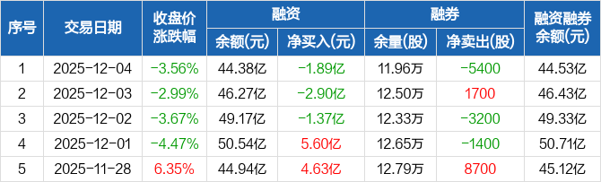 融资方面,当日融资买入5.64亿元,融资偿还7.53亿元,融资净偿还1.89亿元,净偿还额两市排名第六,连续3日净偿还累计6.16亿元。融券方面,融券卖出600股,融券偿还6000股,融券余量11.96万股,融券余额1460.91万元。融资融券余额合计44.53亿元。