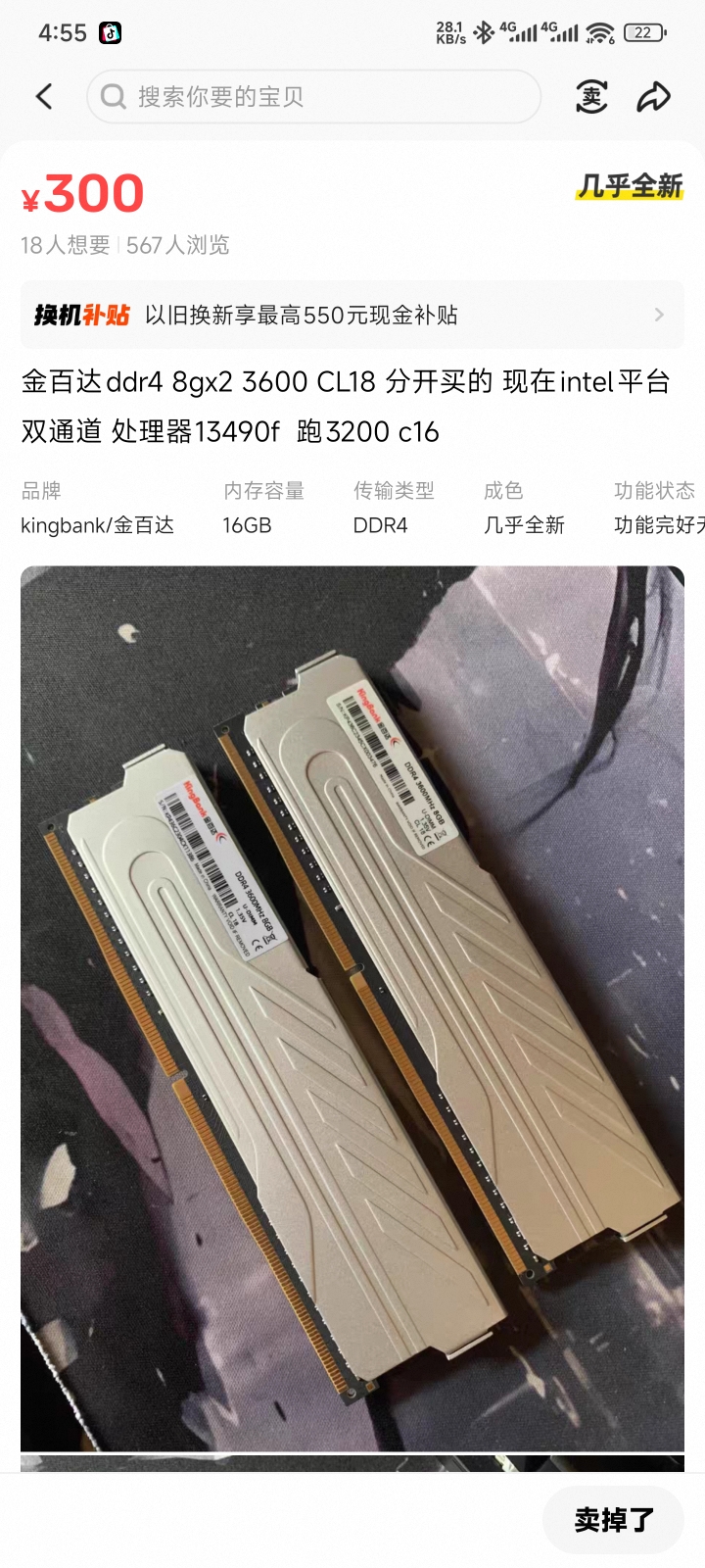 我咸鱼300买的两条金百达 海力士3600×8G 2条