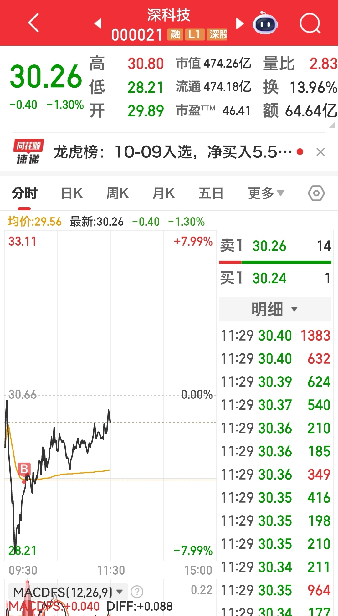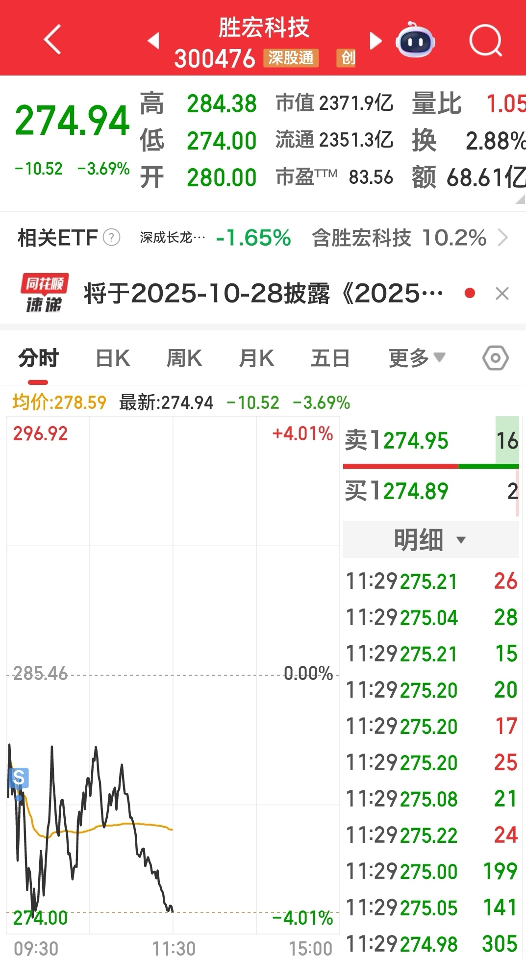 今天10月10日上午的操作:$胜宏科技(SZ300476)$ 在280元继续减仓,目前持股占比50%;44.5元箱底补仓$长电科技(SH600584)$ ;$深科技(SZ000021)$ 创出历史新高回调5日线,在29.38元新建仓。