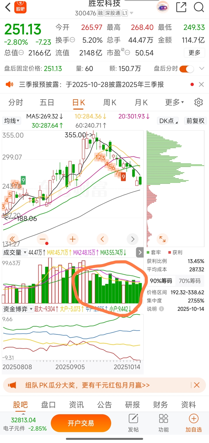 $胜宏科技(SZ300476)$ 说句不好听的:赶快跑。日线成交量柱全是空方量柱,特别的是空方量密集,这里全是出货区,而且是神仙难救的空方量能密集区。