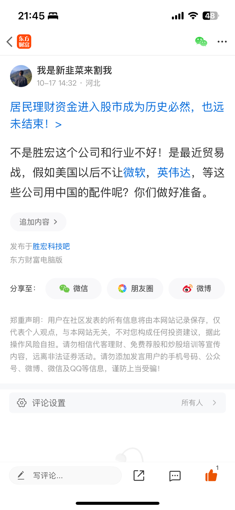 温馨提示: 1.根据《证券法》规定,禁止编造、传播虚假信息或者误导性信息,扰乱证券市场;2.用户在本社区发表的所有资料、言论等仅代表个人观点,与本网站立场无关,不对您构成任何投资建议。用户应基于自己的独立判断,自行决定证券投资并承担相应风险。《东方财富社区管理规定》