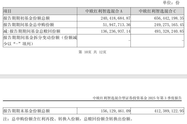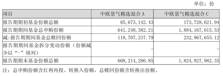 还有中欧景气精选混合,三季度C类份额的申购也超过了18.8亿份,使得期末的份额达到18.25亿份,相当于是期初份额的10倍以上。