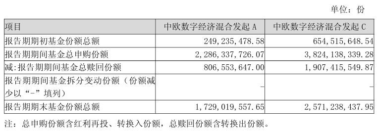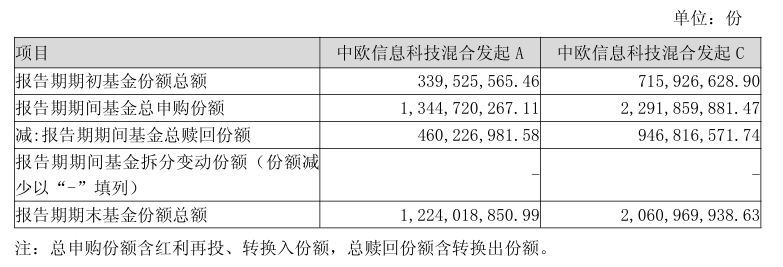 比如中欧信息科技混合,A类份额在三季度申购超过13亿份,C类申购更是接近23亿份,累计份额从期初的10.55亿份大增到期末的32.85亿份。