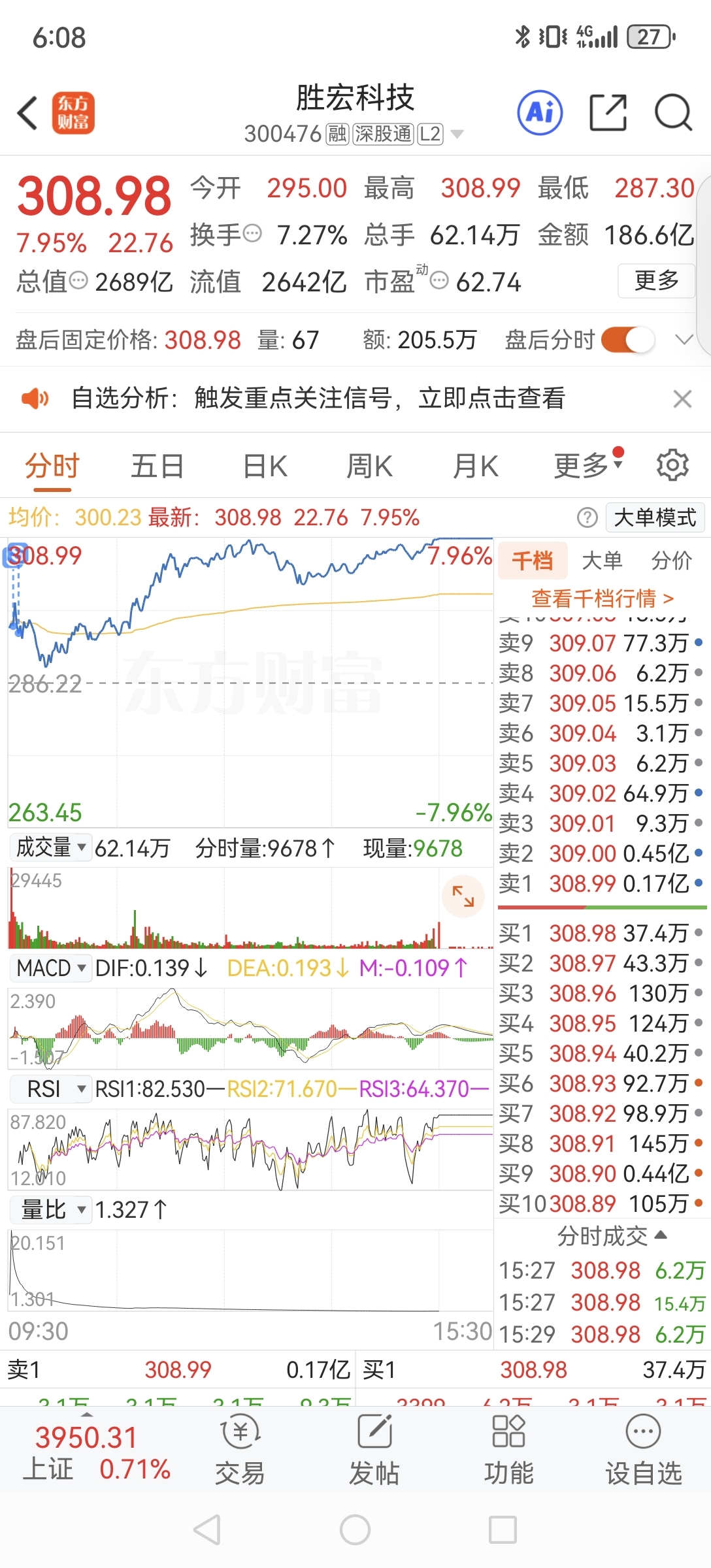 $胜宏科技(SZ300476)$ 早上cpo也在下杀,我一看不对头赶紧跑了,后来只剩下不到一个点涨幅,我还庆幸跑的快,然后就没有然后了,留下了没有格局的泪水,500w仓位啊,少赚25w,日线kdj到顶了,J值119了,实在是不敢再追进来,保住利润要紧