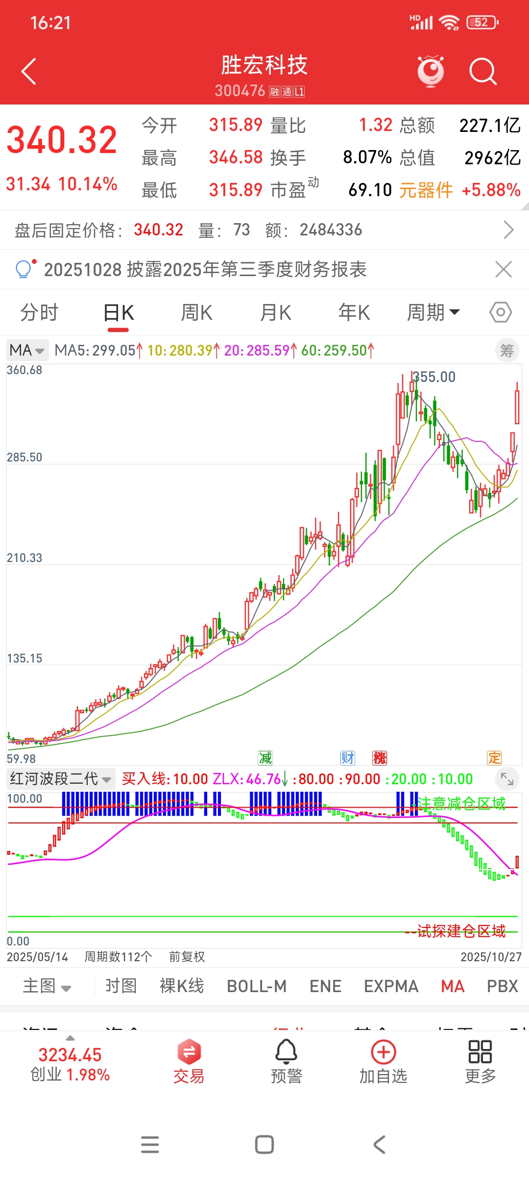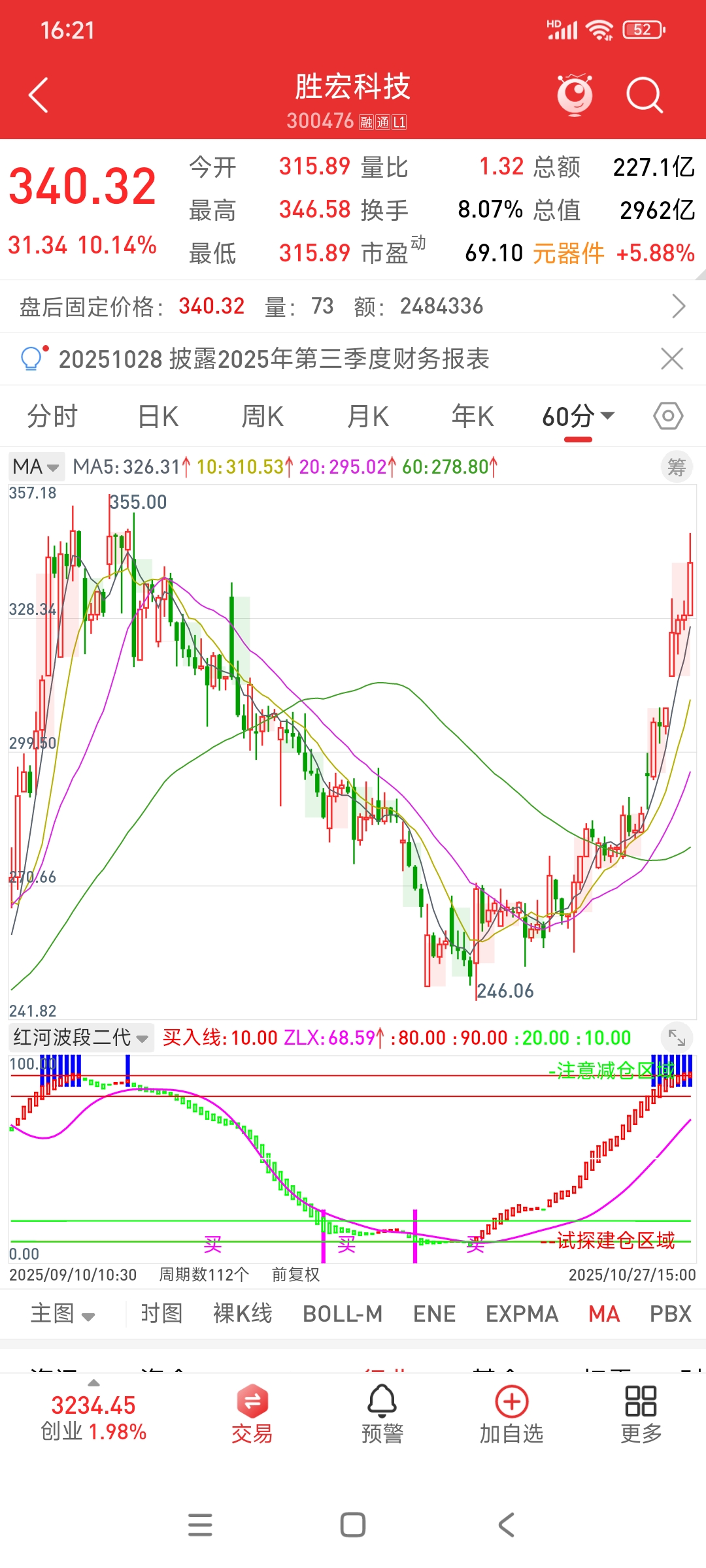 $胜宏科技(SZ300476)$ 60分钟底部出现买字以后叠加绿柱转红柱做确认,然后一路上扬至今,日线也被60分钟线带到翻红了,这就是小级别反转带动大级别的例子,毕竟红柱不停,上涨不止,红柱拉长,加速不止,继续冲