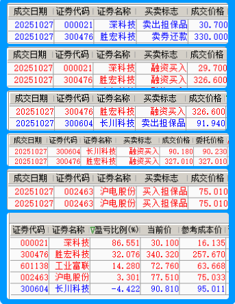 10.27进出胜宏科技、沪电股份、长川科技、深科技情况