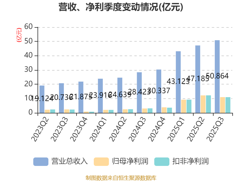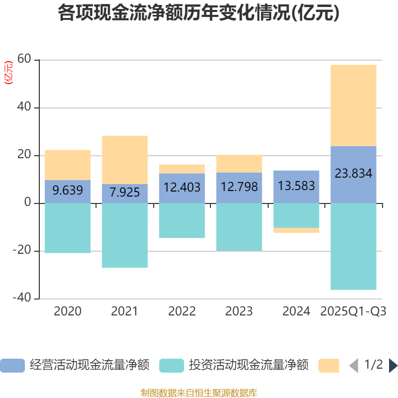 2025年前三季度,公司经营活动现金流净额为23.83亿元,同比增长94.28%;筹资活动现金流净额34.02亿元,同比增加37亿元;投资活动现金流净额-36.39亿元,上年同期为-9.93亿元。