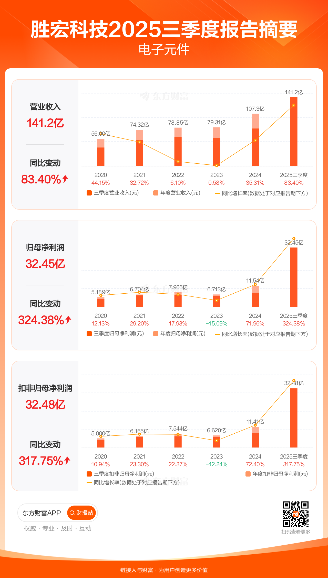胜宏科技10月28日发布2025年三季报显示,公司前三季实现营业收入141.17亿元,同比增长83.40%;归母净利润32.45亿元,同比增长324.38%;扣非归母净利润32.48亿元,同比增长317.75%。