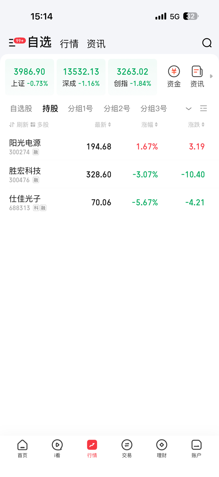 $胜宏科技(SZ300476)$ $阳光电源(SZ300274)$ 以下为收盘持仓情况,继昨日404止盈新易盛仓位平调阳光电源184买入,今日做T继续持有,胜宏科技尾盘加了点仓,仕佳光子前几日高点减仓,目前成本已为负数,小仓位继续保留