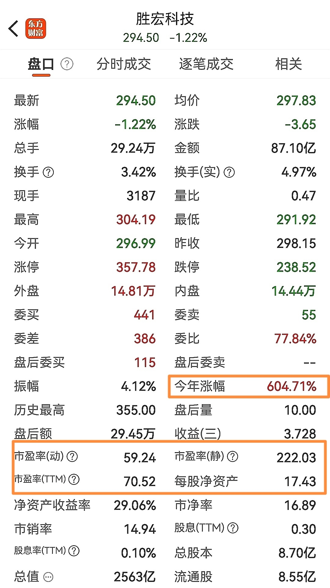 胜宏科技,周二盘后,2025年的涨幅仍然高达+604.71%;市盈率,仍是高高在