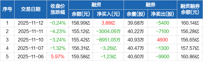 胜宏科技融资融券信息显示,2025年11月12日融资净买入3.88亿元;融资余额158.99亿元,较前一日增加2.5%