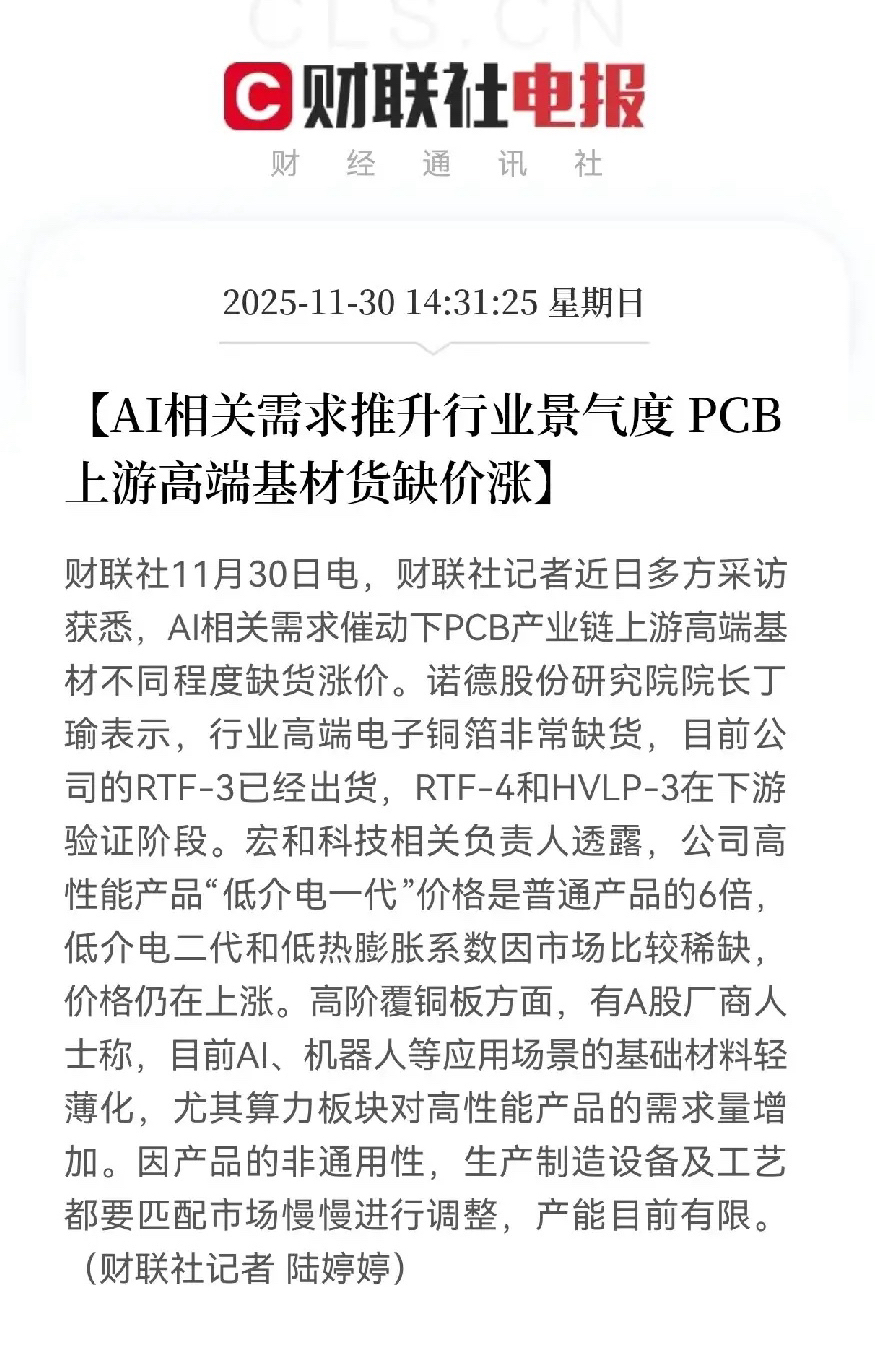 随着AI(含算力、机器人)需求爆发,带动PCB产业链上游高端基材(电子铜箔、高性能覆铜板/电子布等)出现缺货涨价行情。具体表现为:高端电子铜箔供应紧张,如诺德股份的高端铜箔已出货或处于验证阶段;宏和科技的低介电基材价格达普通品6倍且持续上涨;高阶覆铜板因适配AI轻薄化需求,产能因非通用性暂受限,相关企业直接受益于行业景气度提升。