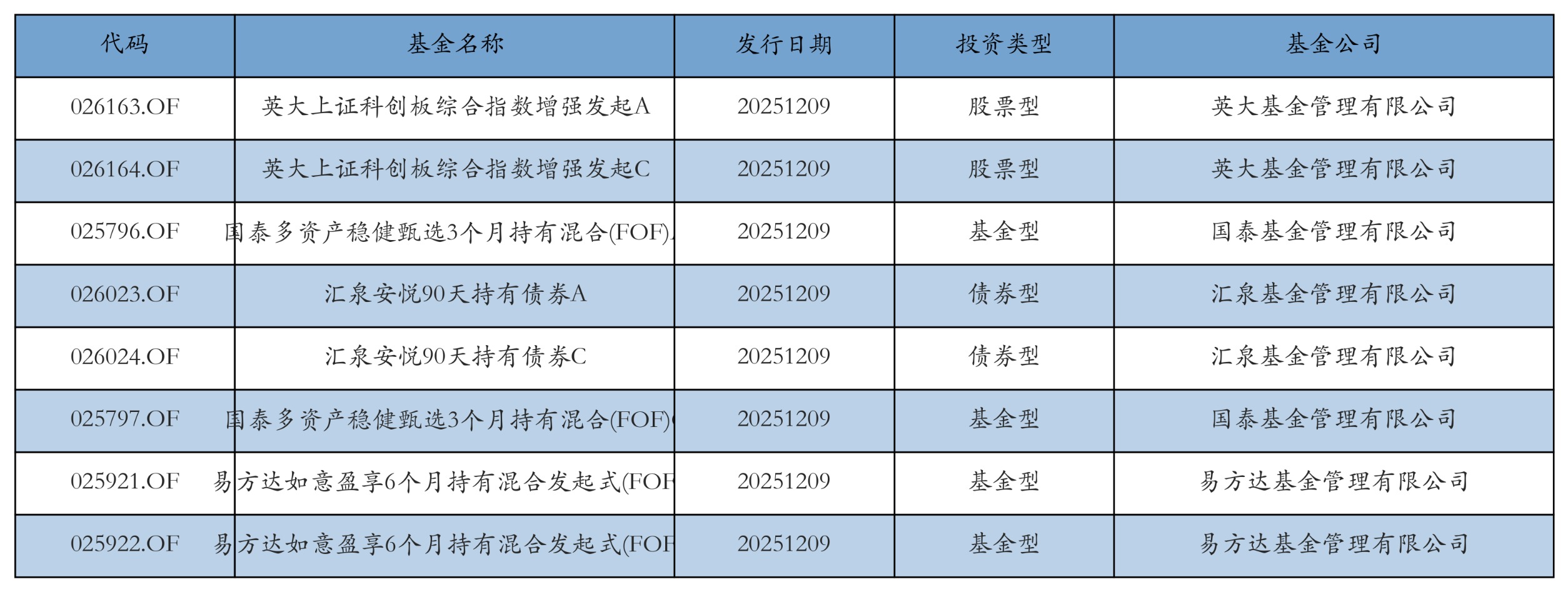 昨日有8只新基金发行,分别为:英大上证科创板综合指数增强发起A、英大上证科创板综合指数增强发起C、国泰多资产稳健甄选3个月持有混合(FOF)A、汇泉安悦90天持有债券A、汇泉安悦90天持有债券C、国泰多资产稳健甄选3个月持有混合(FOF)C、易方达如意盈享6个月持有混合发起式(FOF)A、易方达如意盈享6个月持有混合发起式(FOF)C,详情见下表: