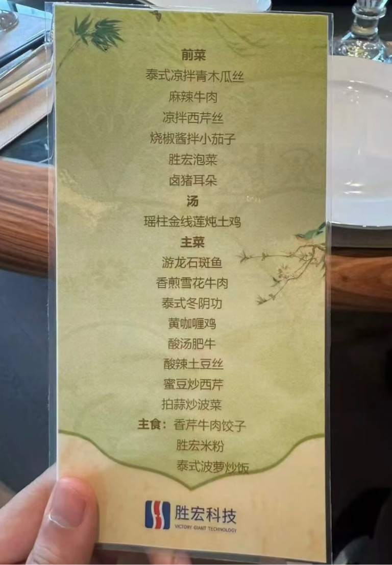 近日,一张胜宏科技调研团的菜单在股民圈里炸开了锅。这份菜单不仅涵盖泰式凉拌青木瓜丝、麻辣牛肉等精致前菜,还有瑶柱金线莲炖土鸡的滋补靓汤,主菜更是集齐游龙石斑鱼、香煎雪花牛肉、泰式冬阴功等硬菜,主食也搭配了香芹牛肉饺子、泰式菠萝炒饭等花样品类,堪称“星级宴席”规格。