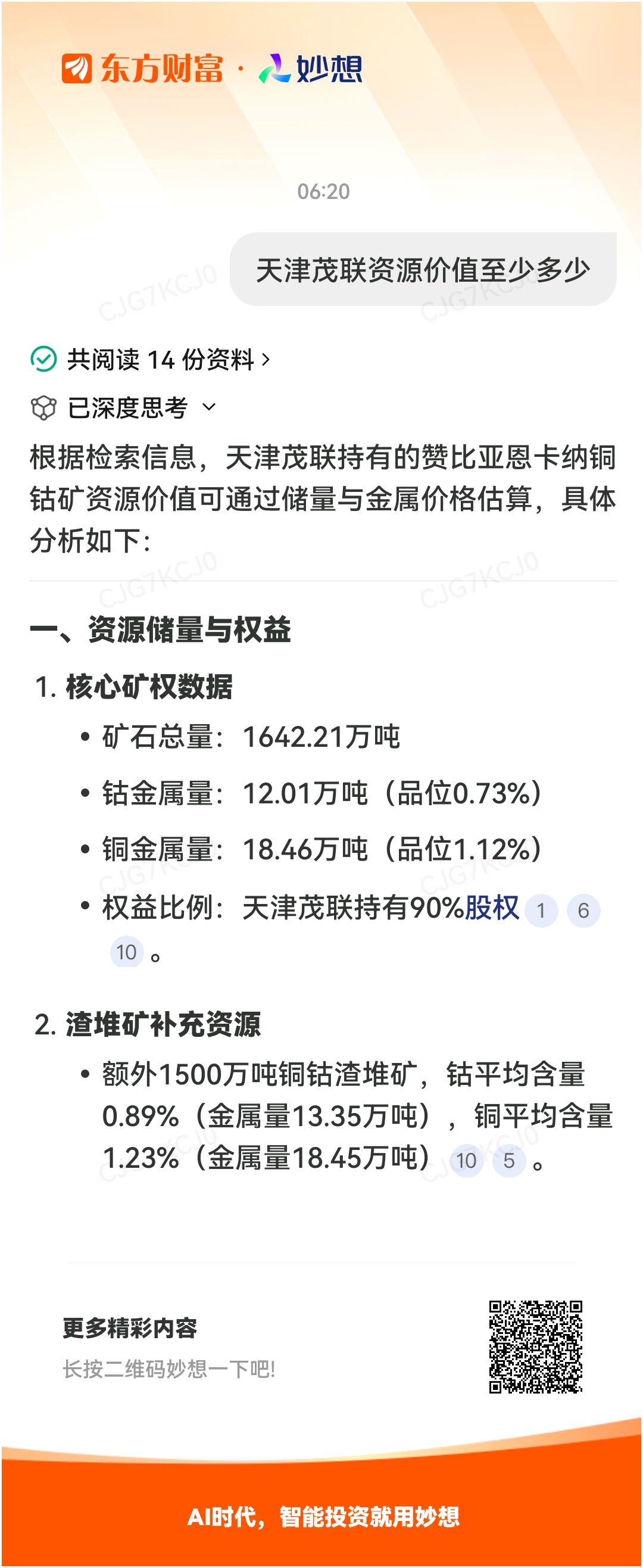 #@妙想,你怎么看?# 妙想一下:天津茂联资源价值至少多少ST合纵间接持有天津茂联37%股权,该公司资源价值至少400亿,一旦复产,合纵科技至少十倍上涨空间。另外磷酸铁锂产能目前30万吨,随着行业复苏,可能就是前几年的江特电机$ST合纵(SZ300477)$ $多氟多(SZ002407)$ $天际股份(SZ002759)$