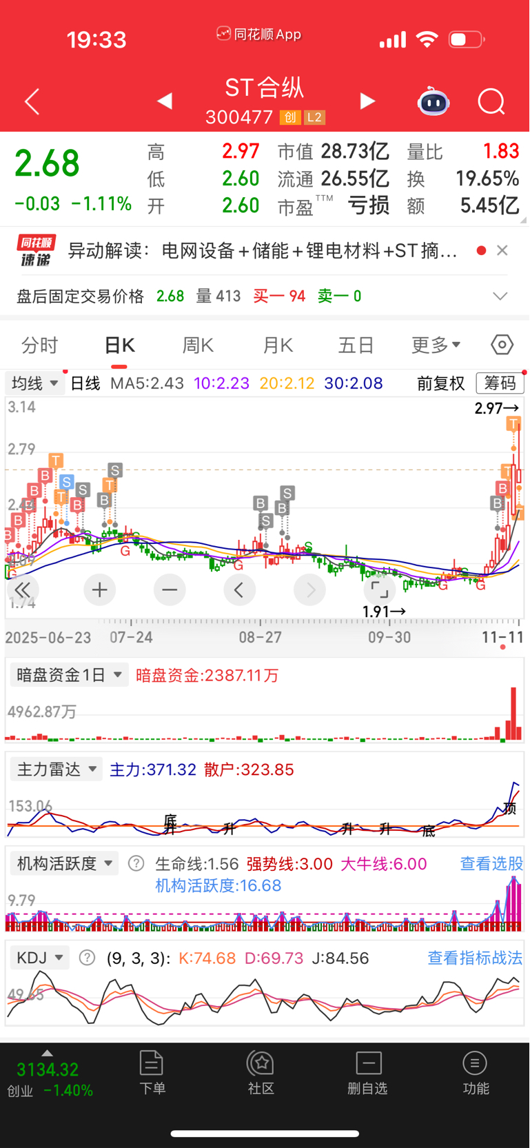 $ST合纵(SZ300477)$ 明天继续往上攻,主力资流入了2千多元的,个人觉得是洗盘,特别是尾收绿是为吓退不坚定者!
