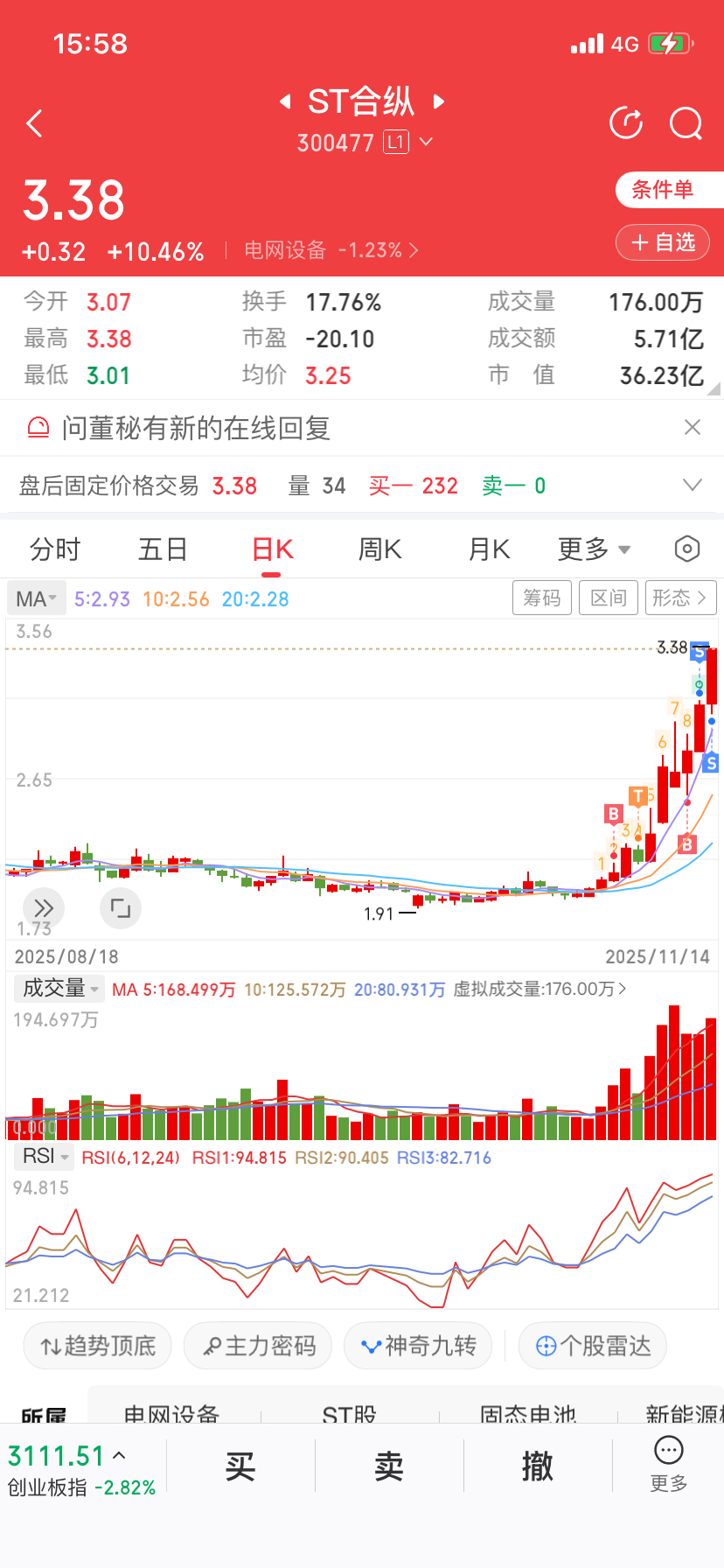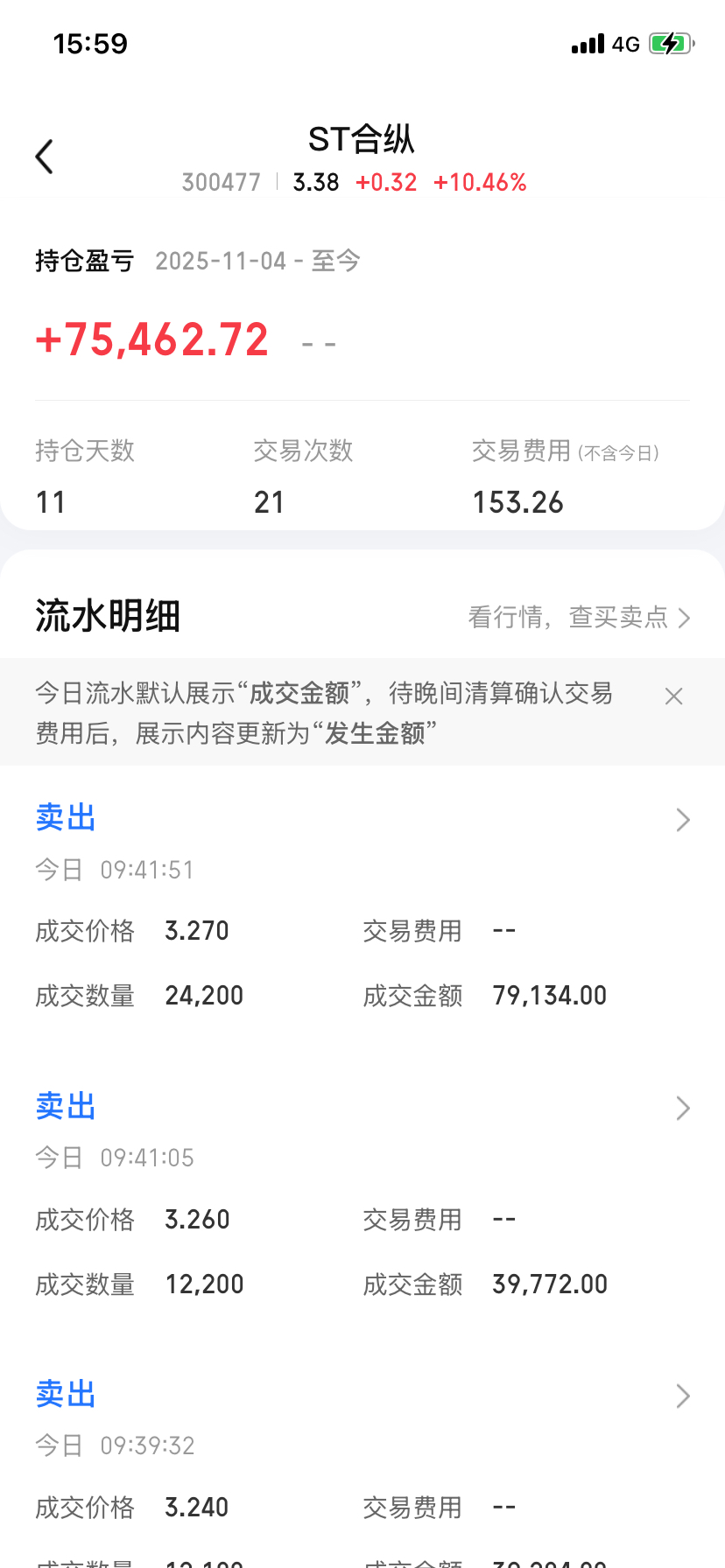 $ST合纵(SZ300477)$ 已清仓,删自选,盈利50%+。走后感觉收盘还挺强的,里面的兄弟可以再拿一两天看看说不定有惊喜。反正下周肯定是大起大落了。另外说下,我去了st岭南st岩石,看好的兄弟欢迎一起转战那哥俩,一直到12月初都搞他俩了