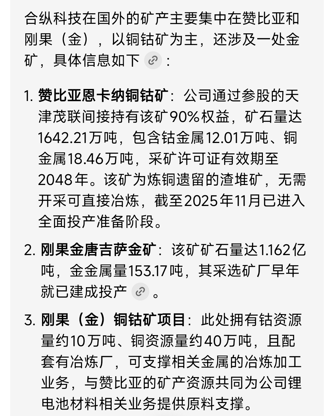 $ST合纵(SZ300477)$ 这就是手里有矿,心里不慌吧,根据最新信息,国外的矿场已经要开始进入投产了,合纵科技会不会是下一个盛屯矿业。