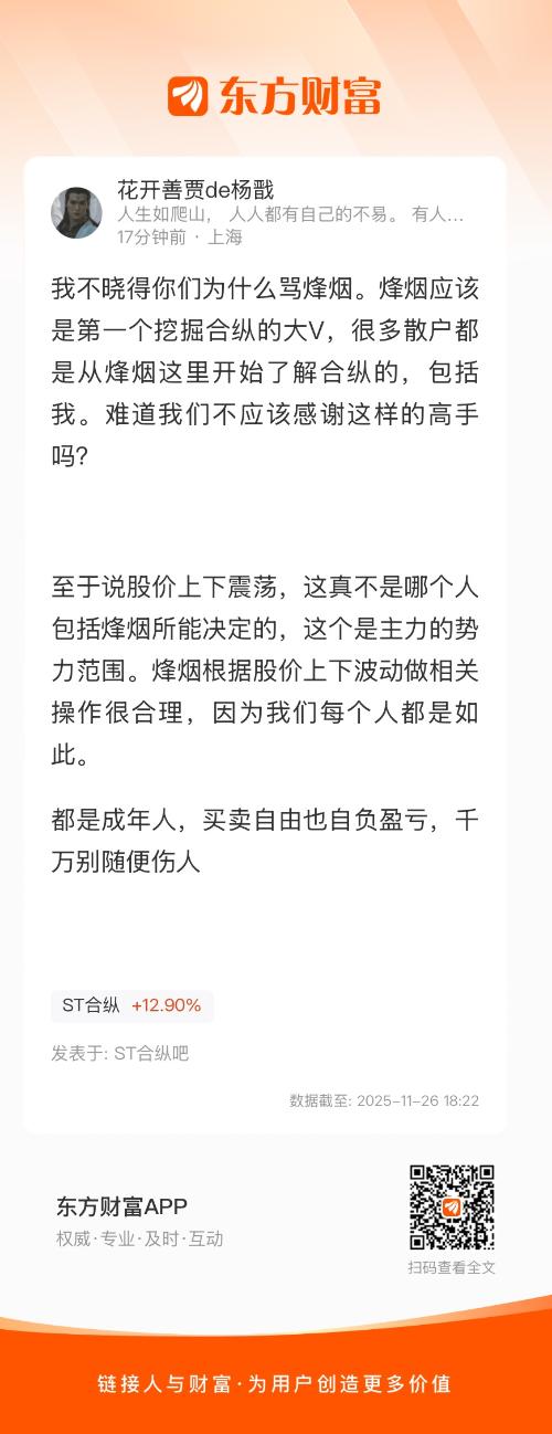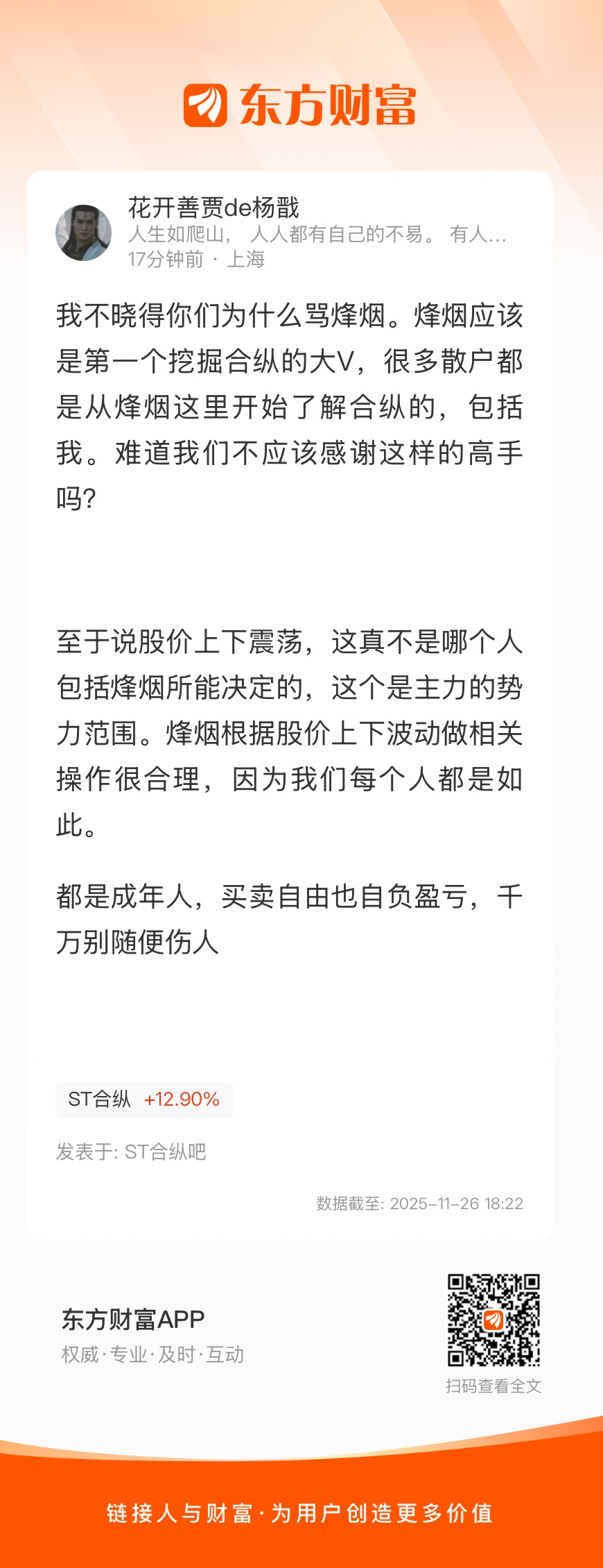 我不晓得你们为什么骂烽烟。烽烟应该是第一个挖掘合纵的大V,很多散户都是从烽烟这里开始了解合纵的,包括我。难道我们不应该感谢这样的高手吗?