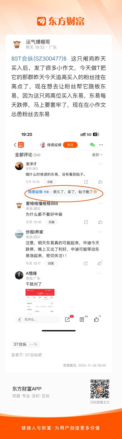 $ST合纵(SZ300477)$ 这只阉鸡昨天买入后,发了很多小作文,今天做T把它的那群昨天今天追高买入的粉丝挂在高点了,现在想去让粉丝帮它跷板东易,因为这只鸡高位买入东易,东易每天跌停,马上要套牢了,现在在小作文怂恿粉丝去东易