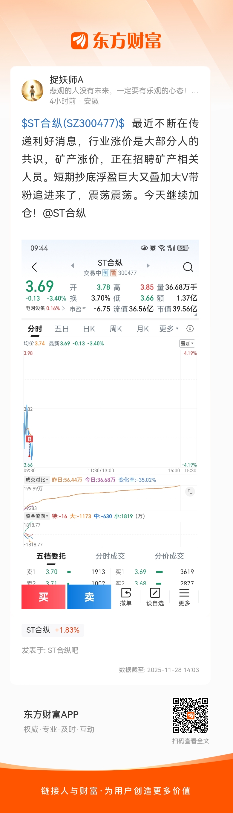 $ST合纵(SZ300477)$ 最近不断在传递利好消息,行业涨价是大部分人的共识,矿产涨价,正在招聘矿产相关人员。短期抄底浮盈巨大又叠加大V带粉追进来了,震荡震荡。今天继续加仓!@ST合纵