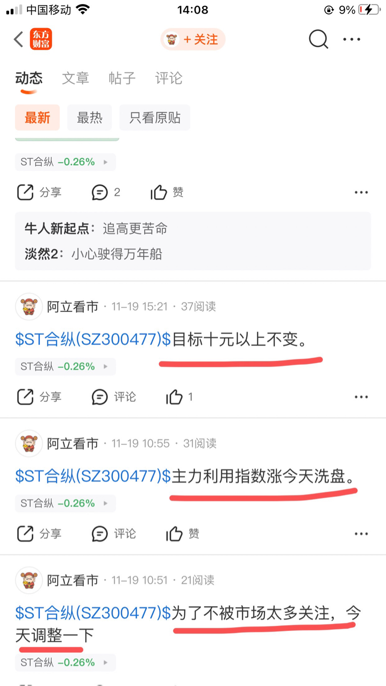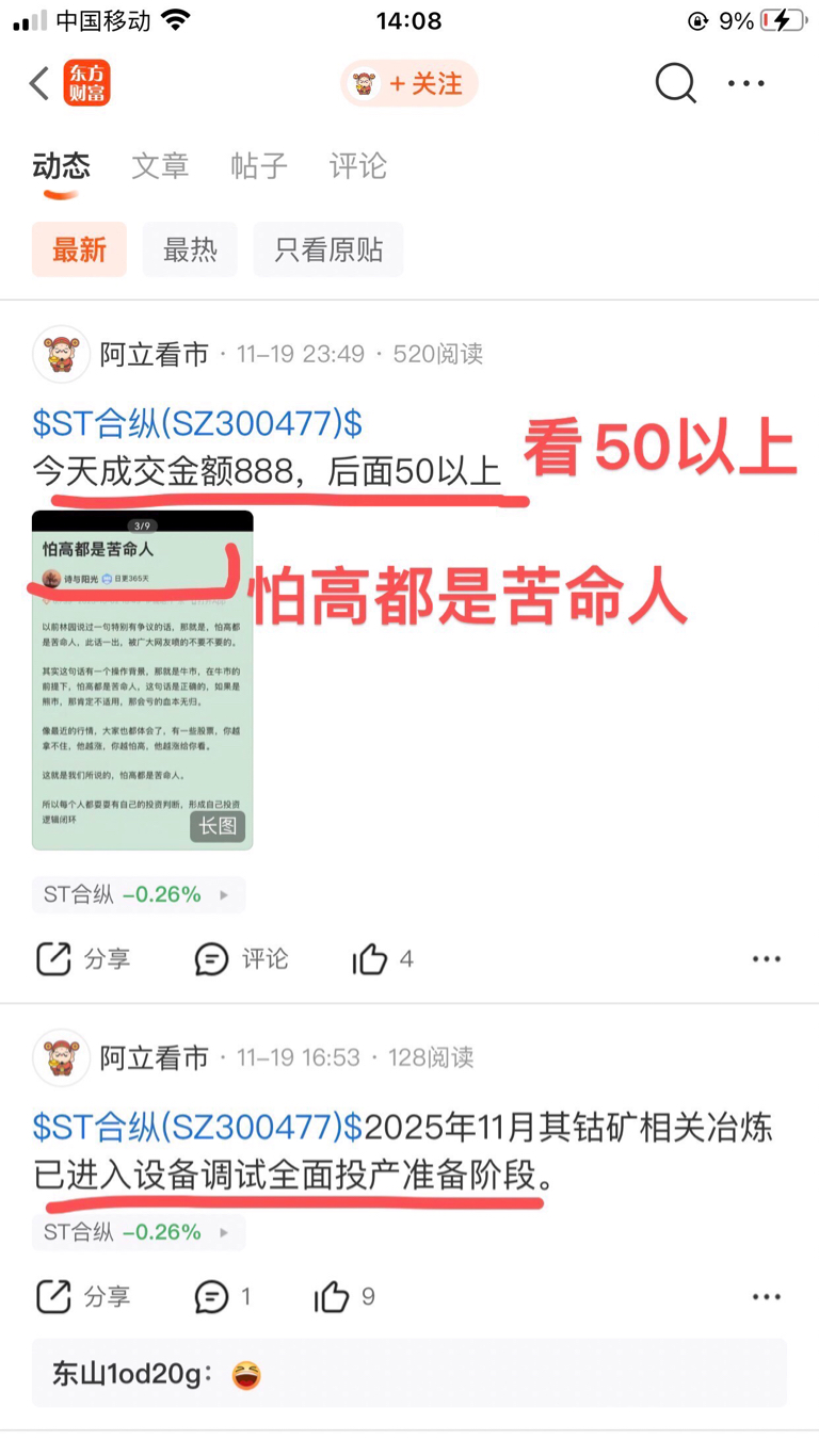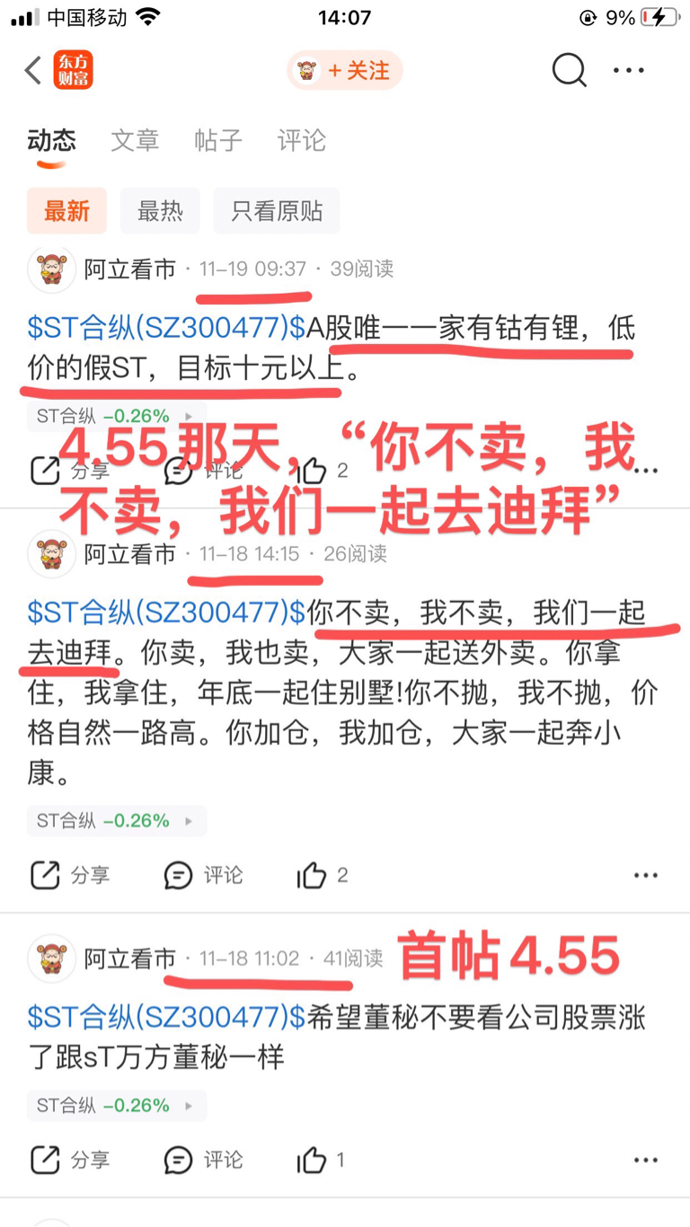 快来吃瓜,阿立看市11月18日4.55元最高那天发的首帖,他自称4.2以上被我忽悠进来的,他在最高点狂吹合纵,后面回落了继续吹“怕高都是苦命人”,“你不卖我不卖,我们一起去迪拜”“看50以上”。后来他3.3以下割肉,然后天天对我进行诽谤
