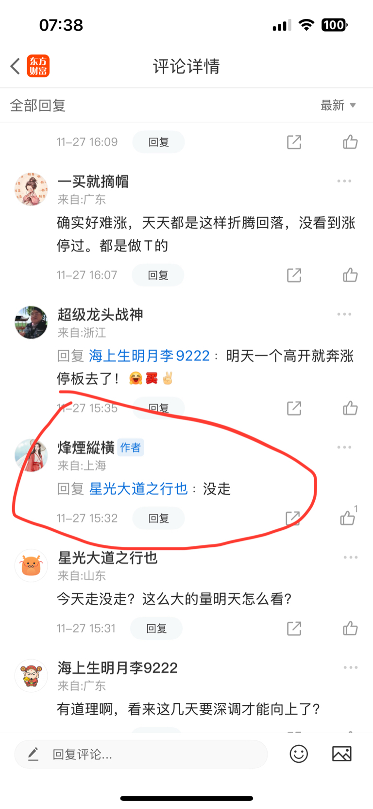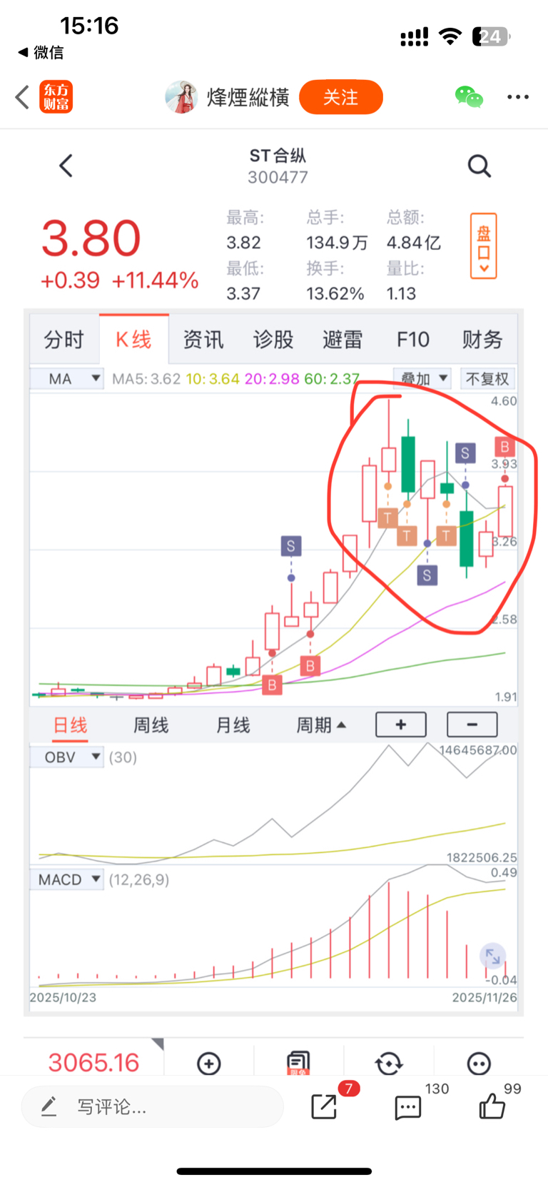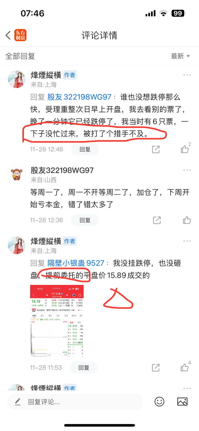 $ST合纵(SZ300477)$ 这只疯阉鸡一只在合纵一边小作文,一边做t,结果自己玩脱了,24号割肉,然后又26号追高,结果被套,那些跟着的粉丝都被割肉的割肉,套牢的套牢,这是罪有应得。又昨天追高七八个点豫光金铅,一堆粉丝跟入,昨天被挂在高点,今天继续跌。这只疯阉鸡东易根本就来不及出它自己都说来不及反应就跌停,怎么可能提前卖出,所以怂恿粉丝去翘板,这也是报应
