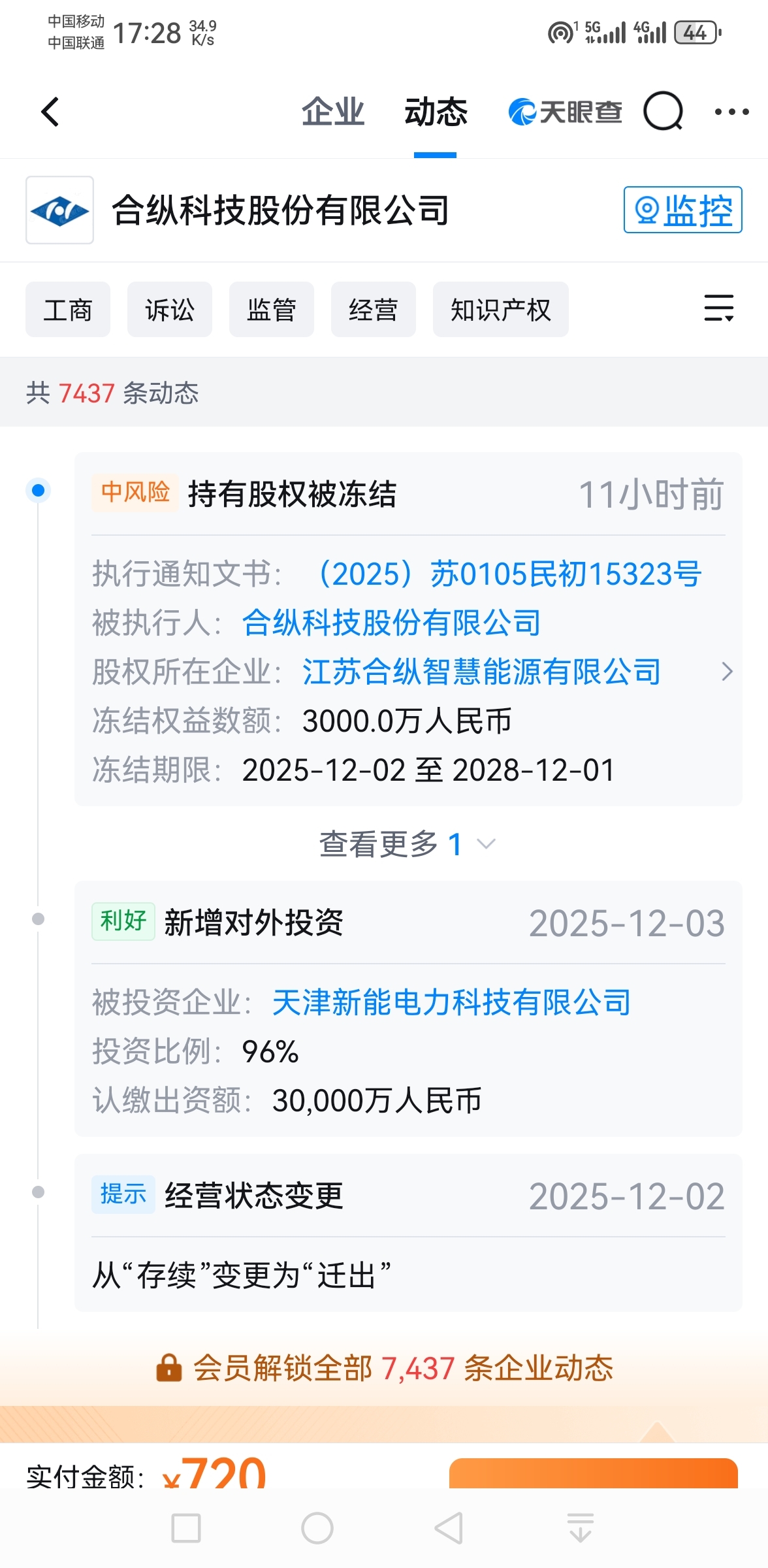 $ST合纵(SZ300477)$ 别说,还真在天眼查里找到了新增对外投资,不是假的,日期都对,2025年12月3日确实新增对外投资3亿,被投企业天津新能电力科技有限公司,这到底是怎么回事?为什么没有公告呢?