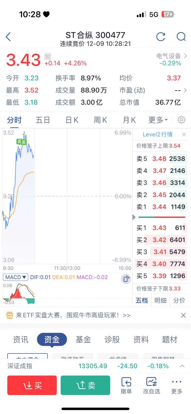 $ST合纵(SZ300477)$ 今天3.5全部跑了,看看下午能不能3.1左右再回去!