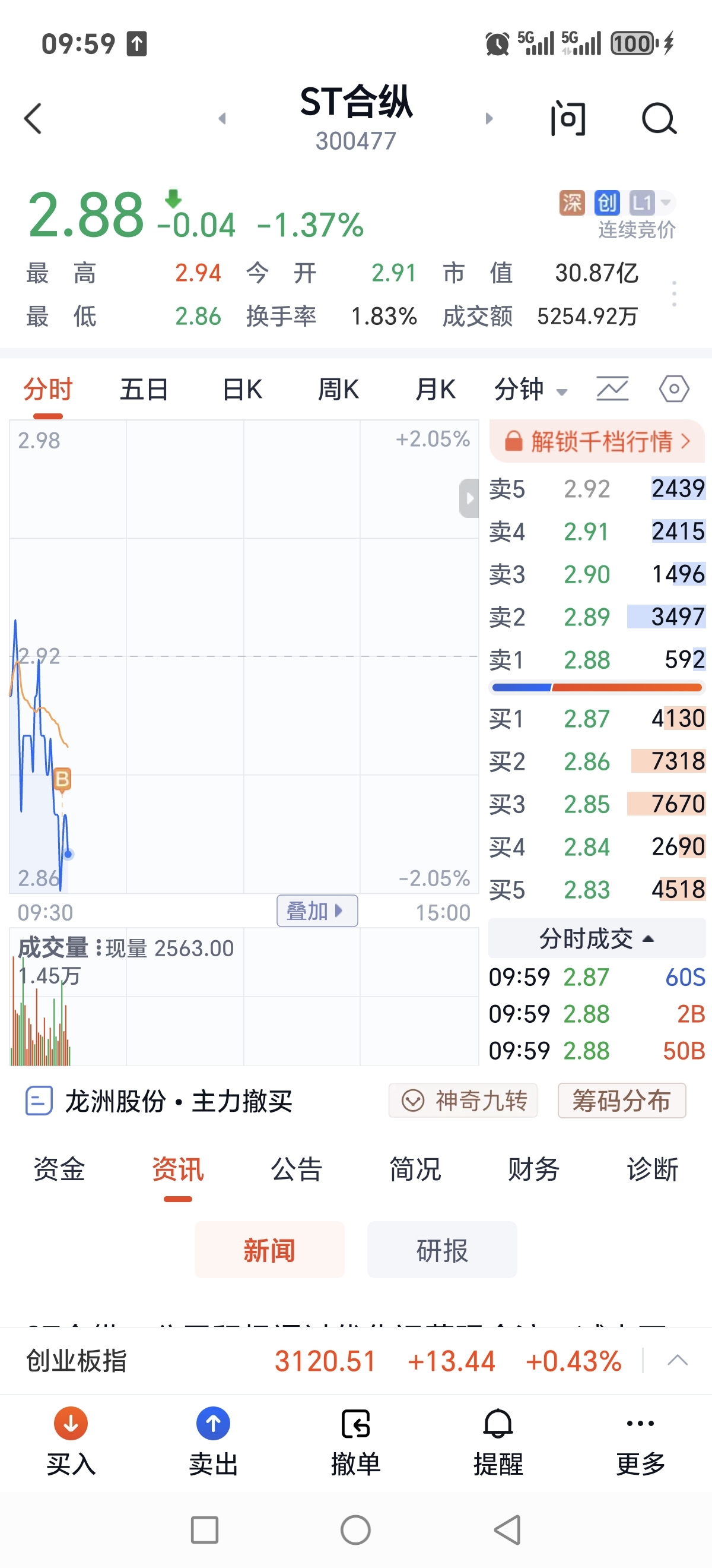 $ST合纵(SZ300477)$ 2.86元已成交,我来了。