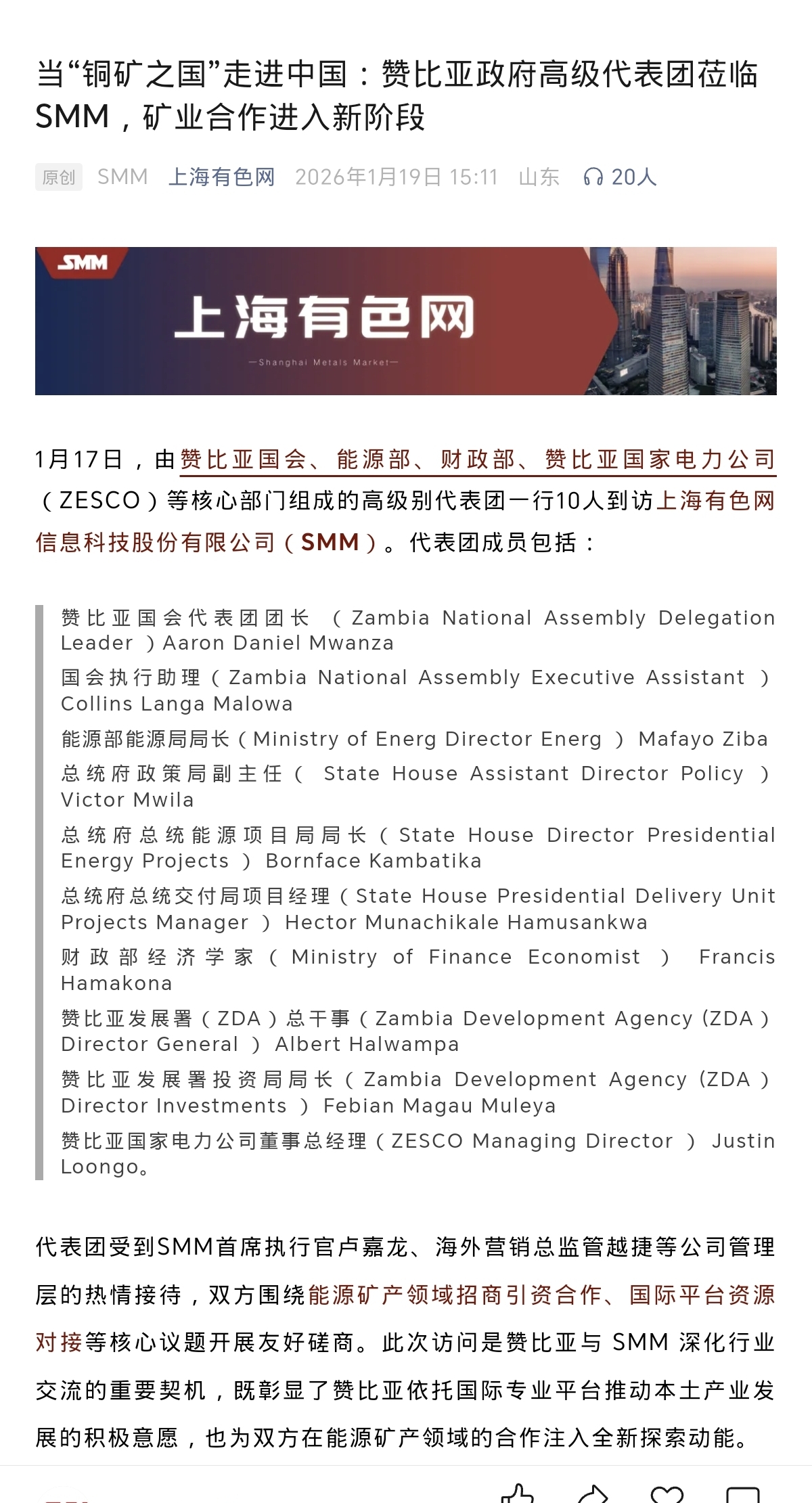 昨天赞比亚国会,能源部,国家电力等核心高级代表团访问上海有色,推动能源,矿产,等合作。(合纵的赞比亚项目政策环境利好)