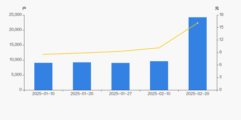 2025年1月10日至今,公司股东户数成倍增长,区间涨幅达167.60%。2025年1月10日至2025年2月20日区间股价上涨87.85%。
