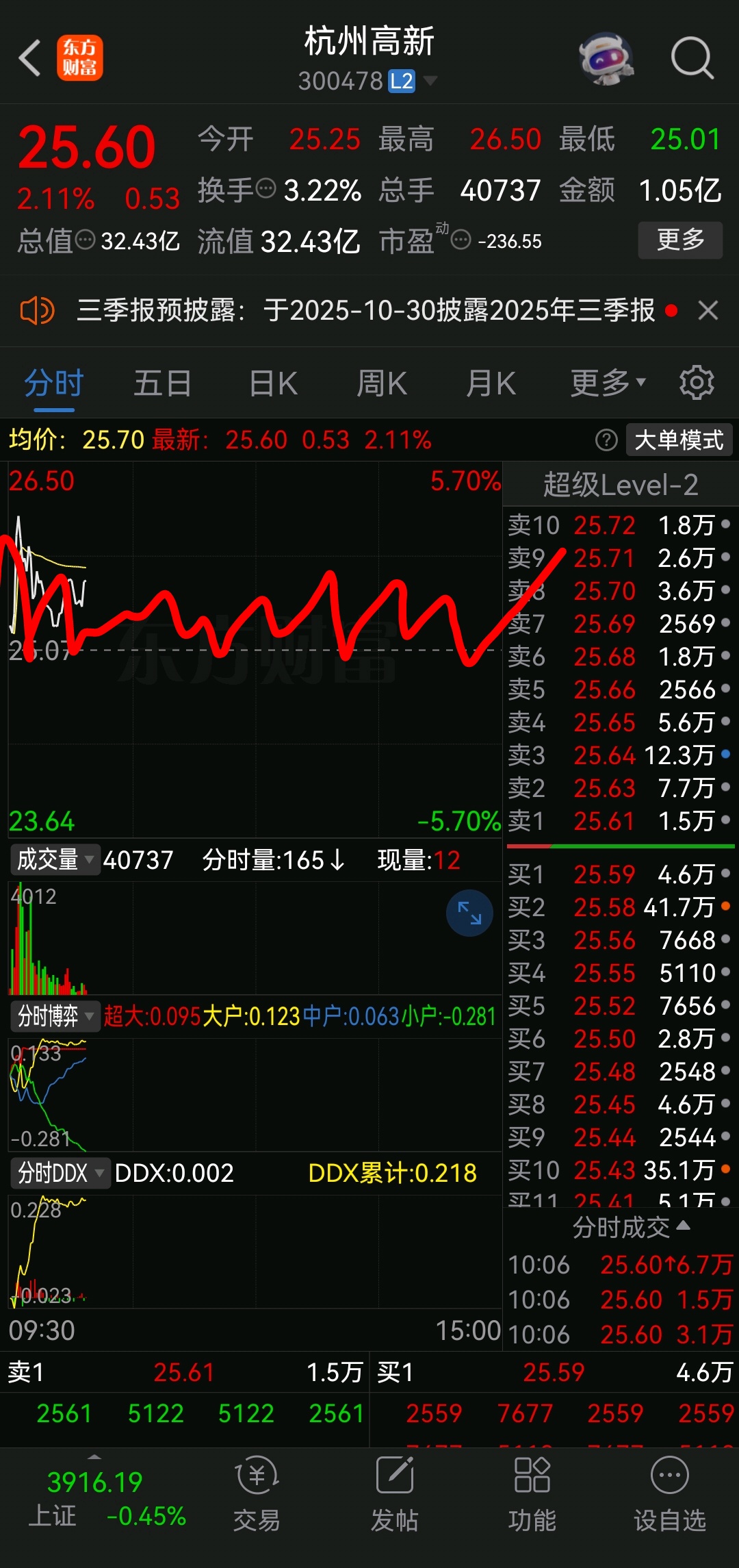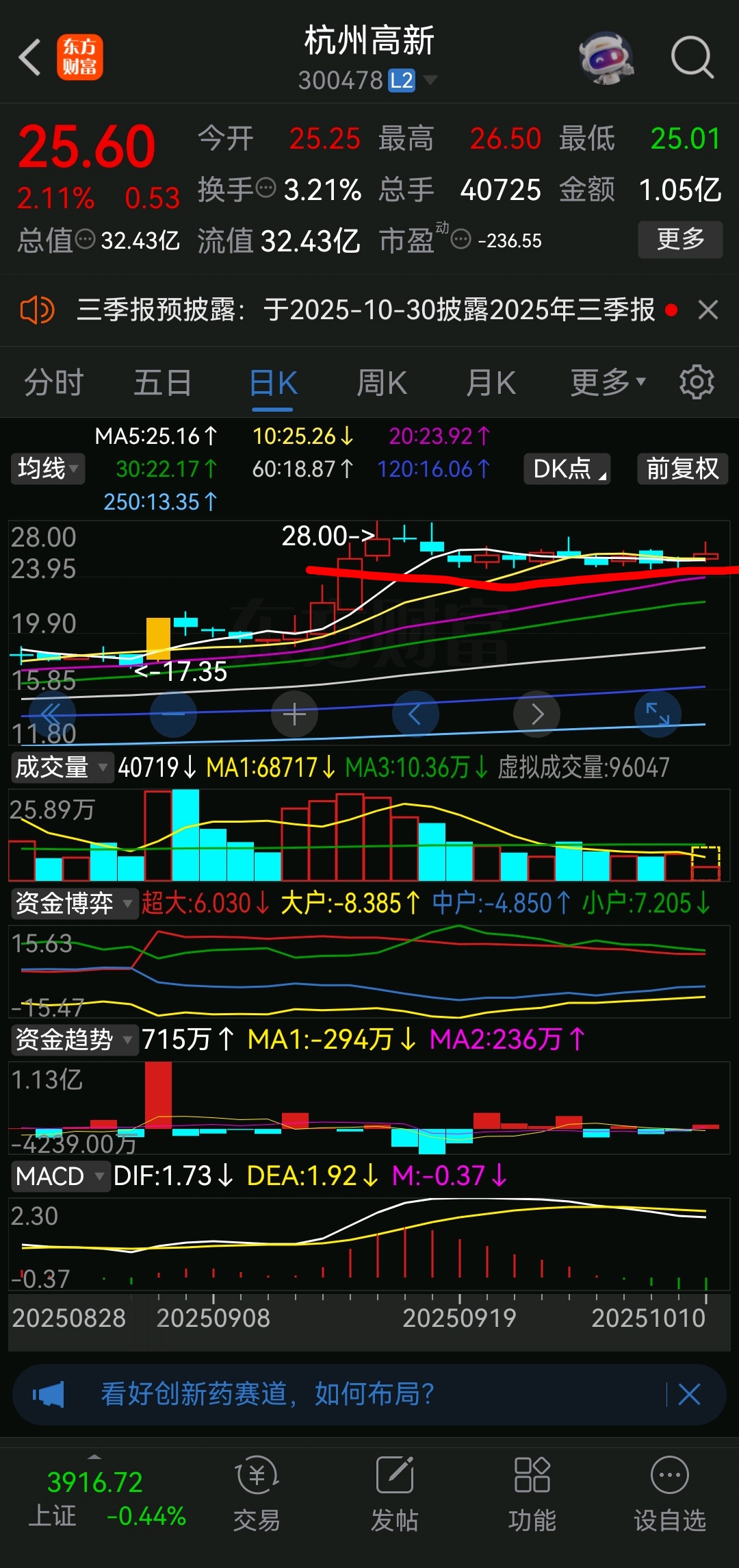 $杭州高新(SZ300478)$ 非常典型的横盘走势,不会有什么异动,昨天大盘和板块暴涨,今天大盘的暴跌,都对杭州高新无影响,不出意外这票就是一直横下去,最后和20天线粘连融合,然后选方向。这里对短线资金已经是没意思的票了。短线大资金也不会来这里。看庄自己表演。