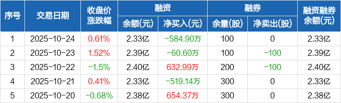 濮阳惠成:融资净偿还584.9万元,融资余额2.33亿元(10-24)