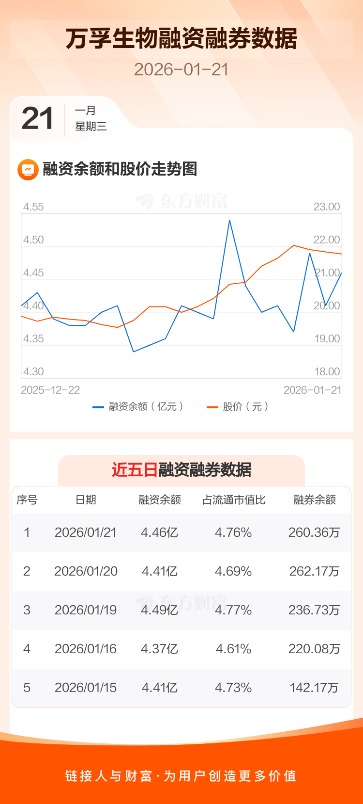 交易所最新数据显示,万孚生物于2026年1月21日获融资买入2797.98万元,融资偿还2252.88万元,当日融资净买入545.1万元。目前,该股融资余额4.46亿,占流通市值比例为4.76%。