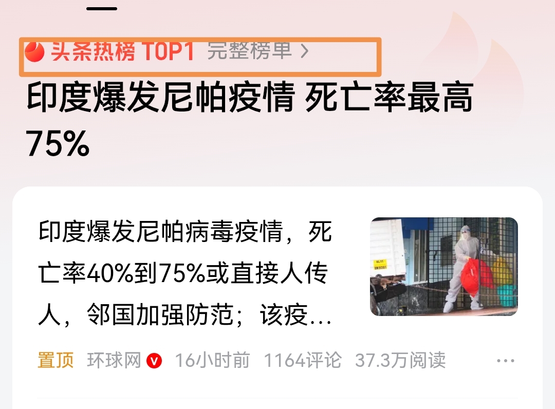 印度爆发尼帕病毒流行,已成头条热榜第一名。